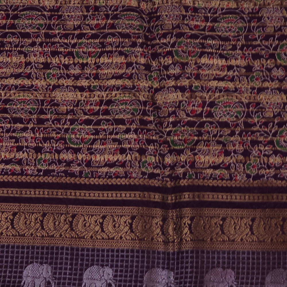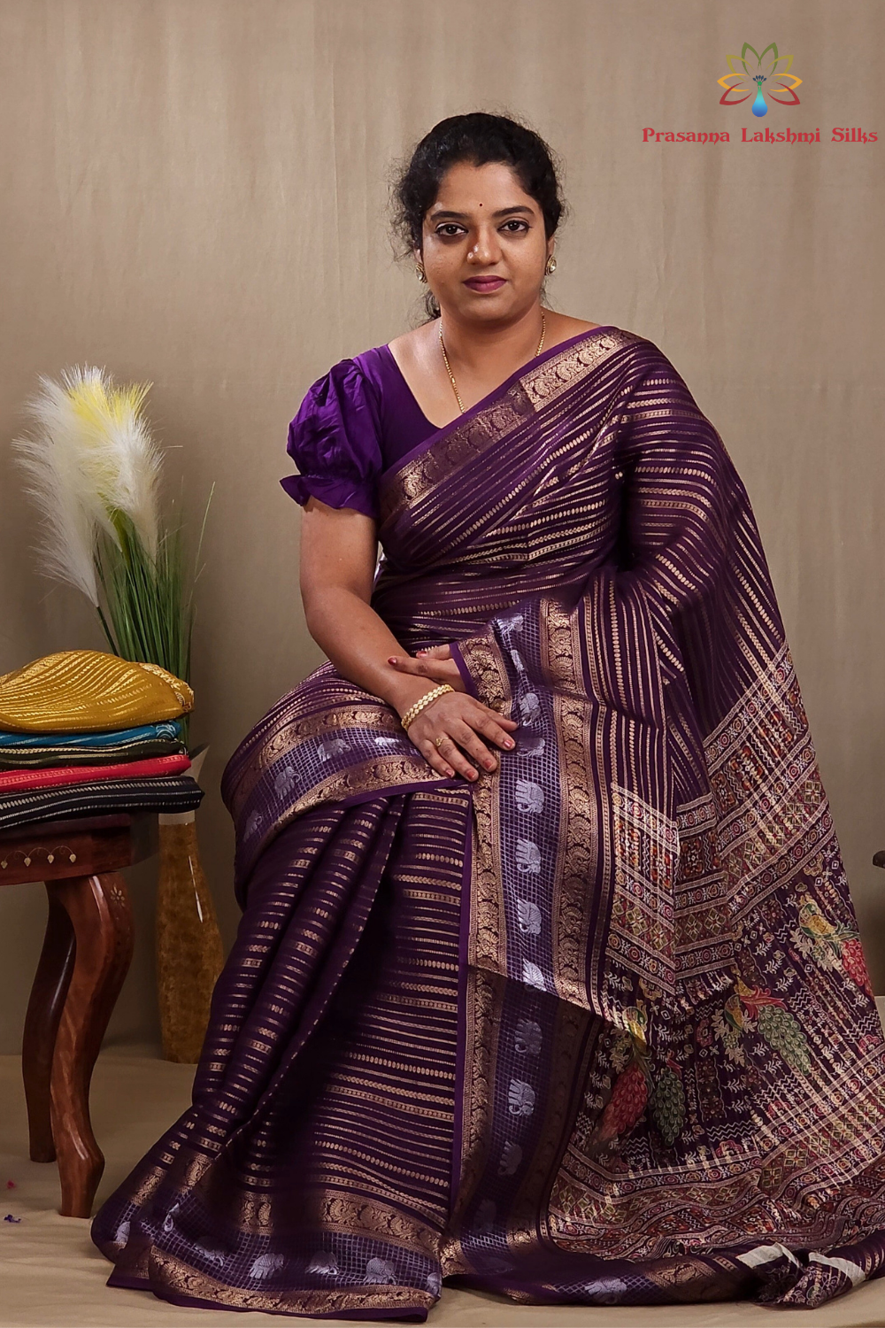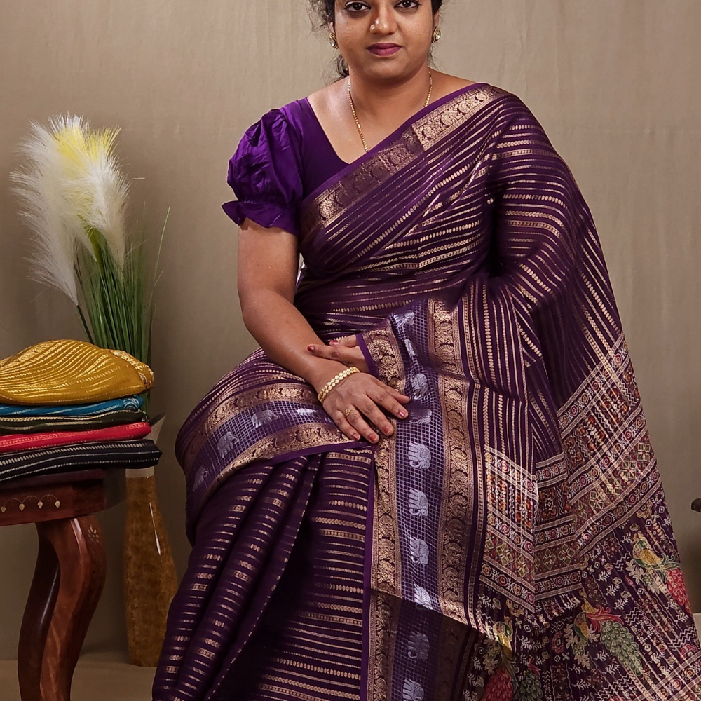 Expereience the grandeur of Georgette sarees allover zariwoven horizontal stripes with uniquely designed peacock gap borders and silver zari-woven elephant motifs, and the pallu is enriched with elegant meenakari work with peacock designs.paired with floral blouse.....