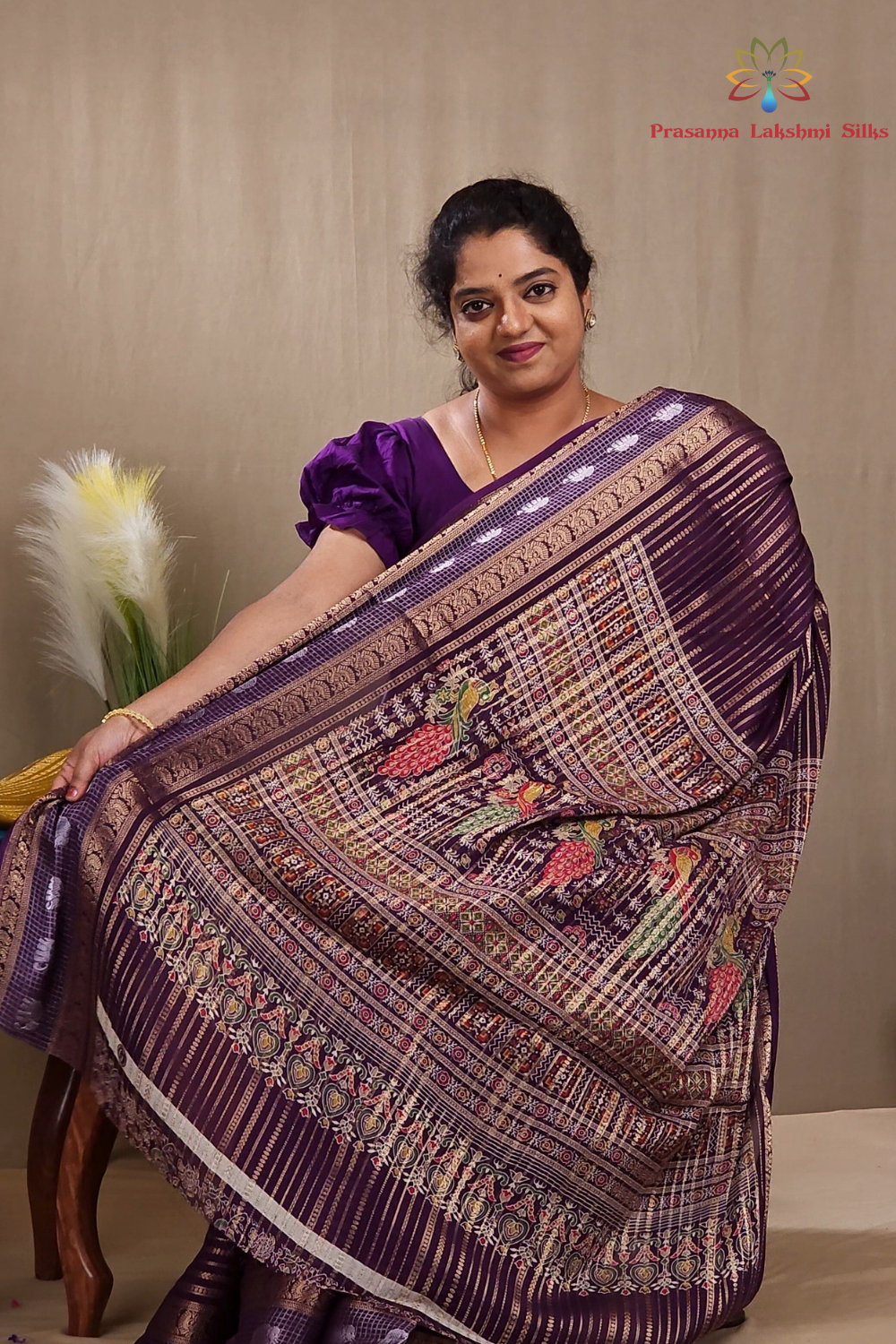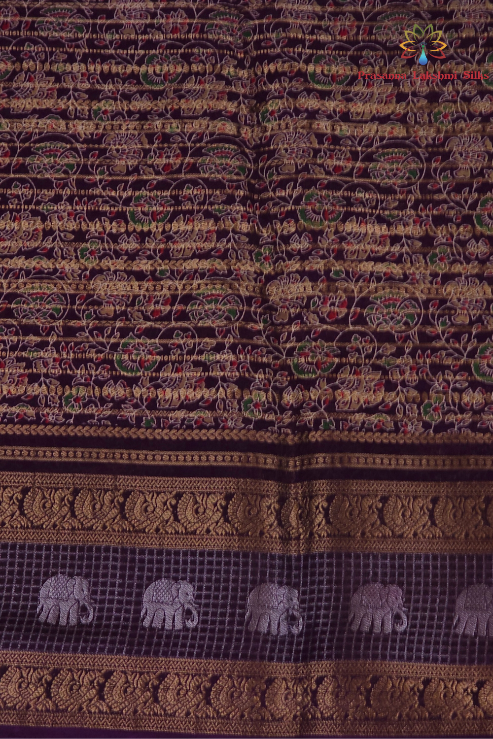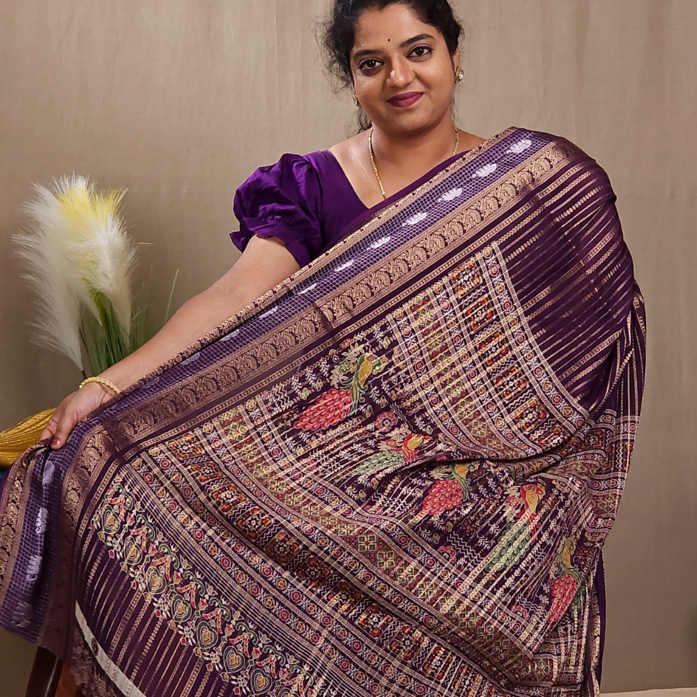 Expereience the grandeur of Georgette sarees allover zariwoven horizontal stripes with uniquely designed peacock gap borders and silver zari-woven elephant motifs, and the pallu is enriched with elegant meenakari work with peacock designs.paired with floral blouse.....