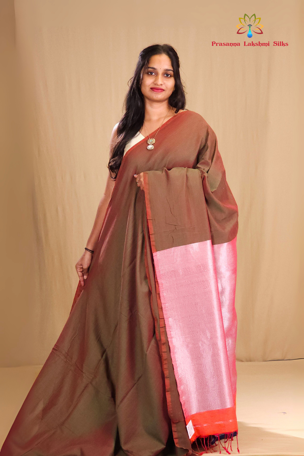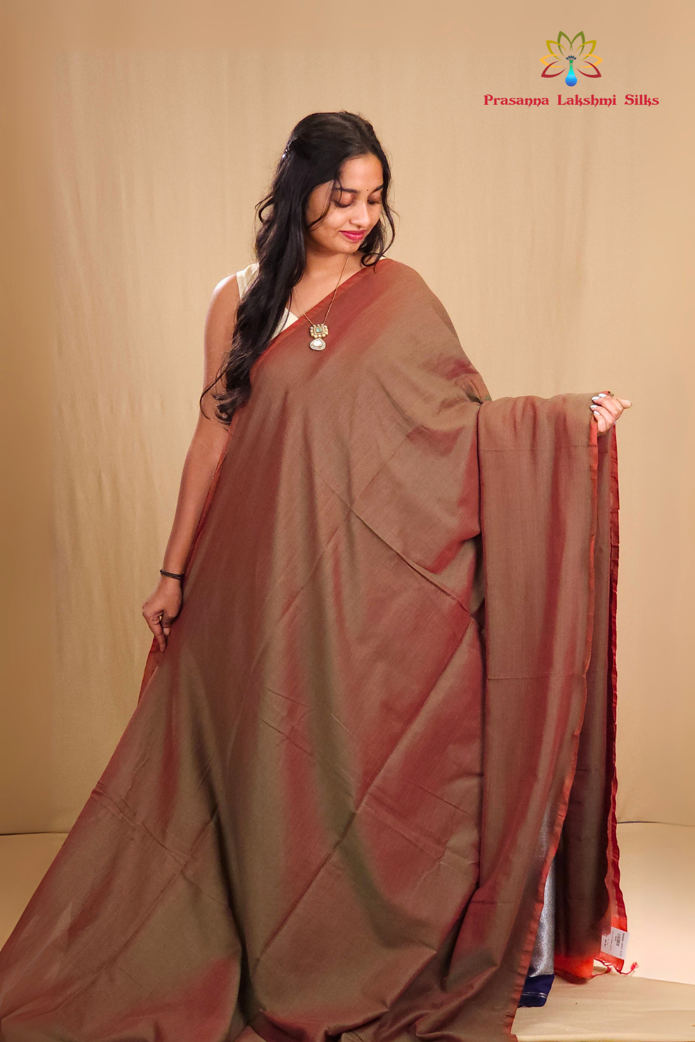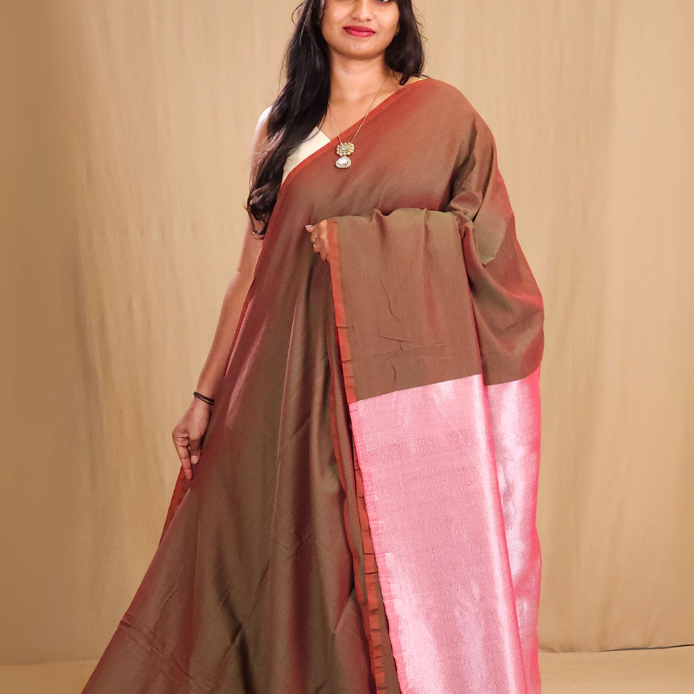 Discover the elegance of our Khadi Cotton Saree, featuring a plain body paired with contrast gold & silver pallu finished with tassels paired with a running blouse.....