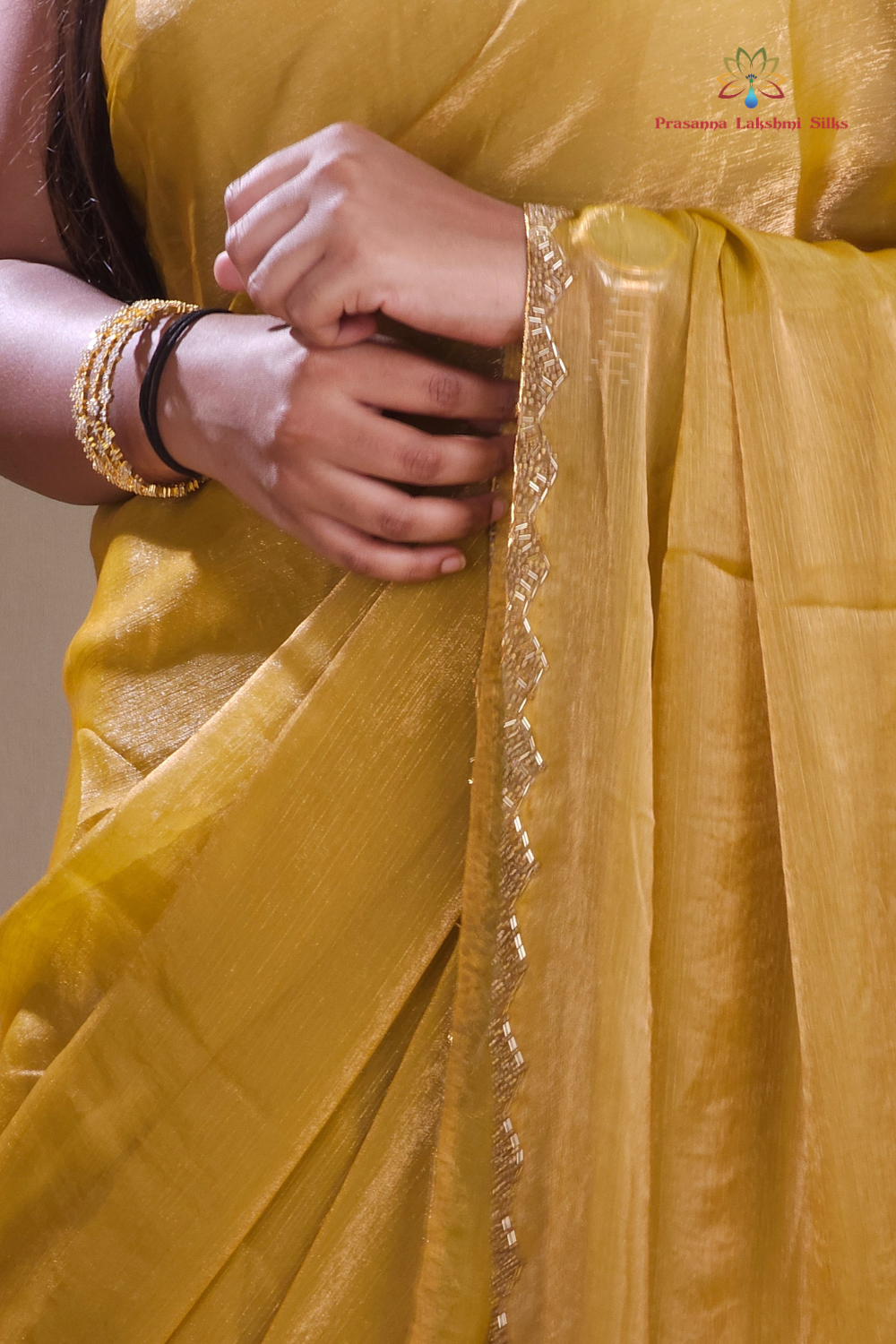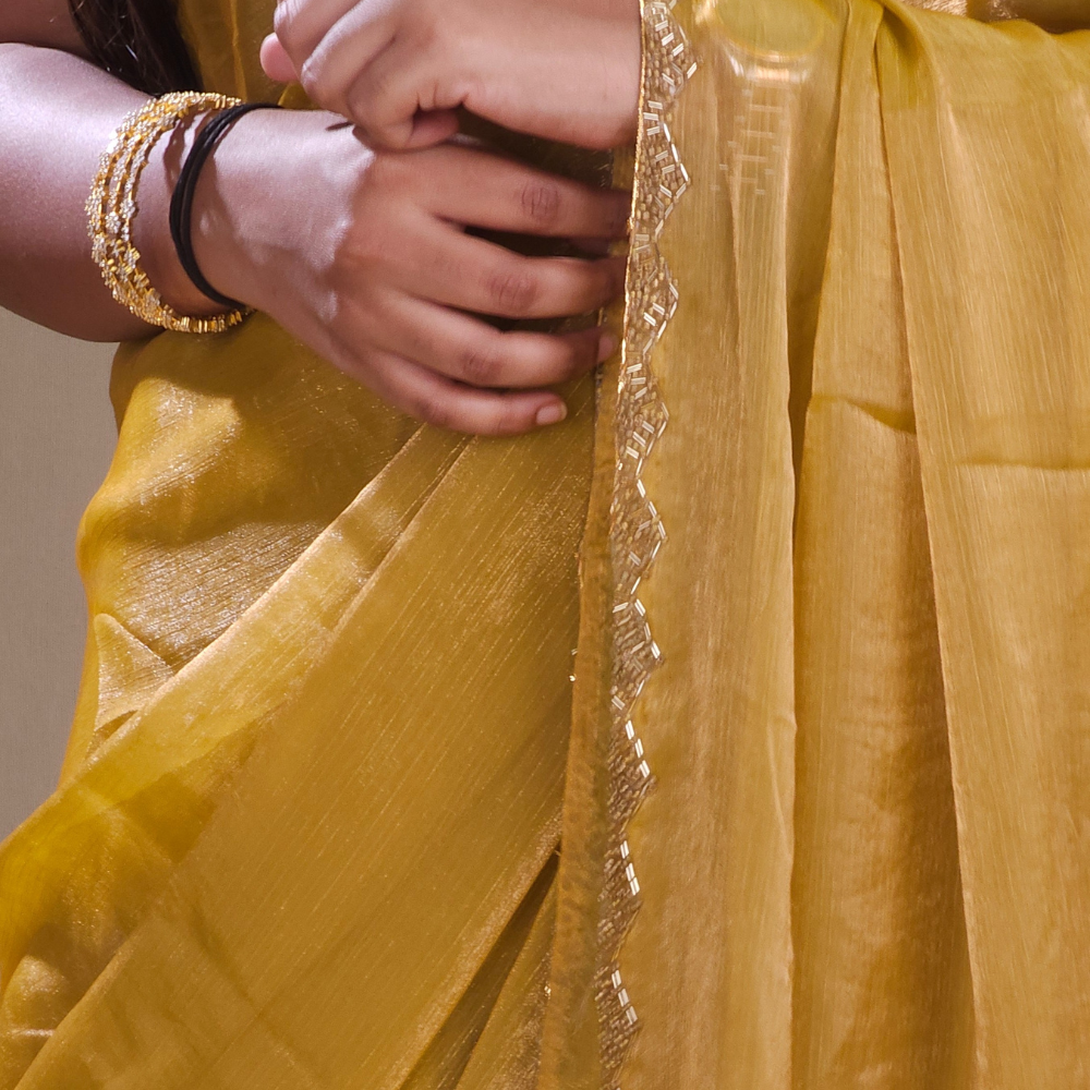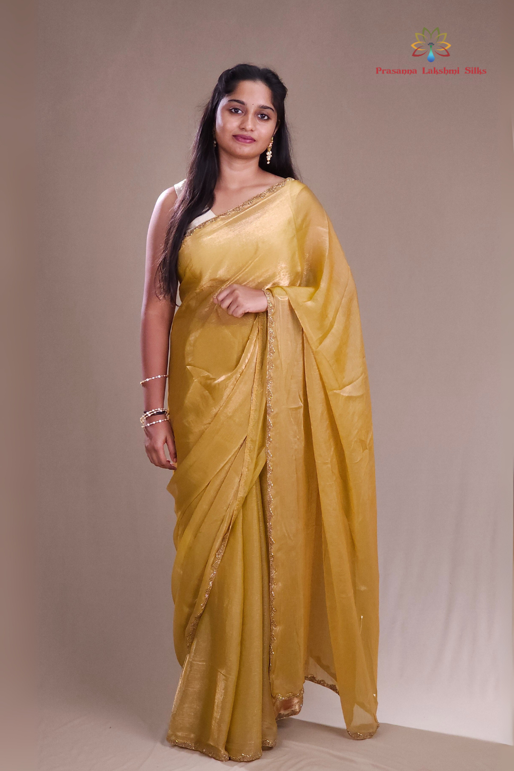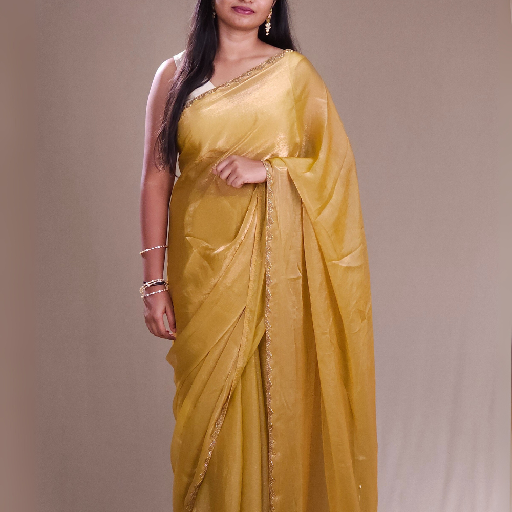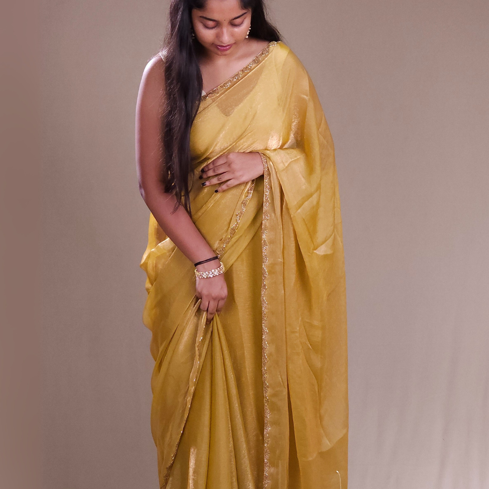 Drape yourself in sheer elegance with our Fendy Chiffon Saree, Featuring beautiful antique beadwork on the borders and pallu, this saree adds a subtle sparkle to your look. Lightweight and graceful, paired with a running blouse......