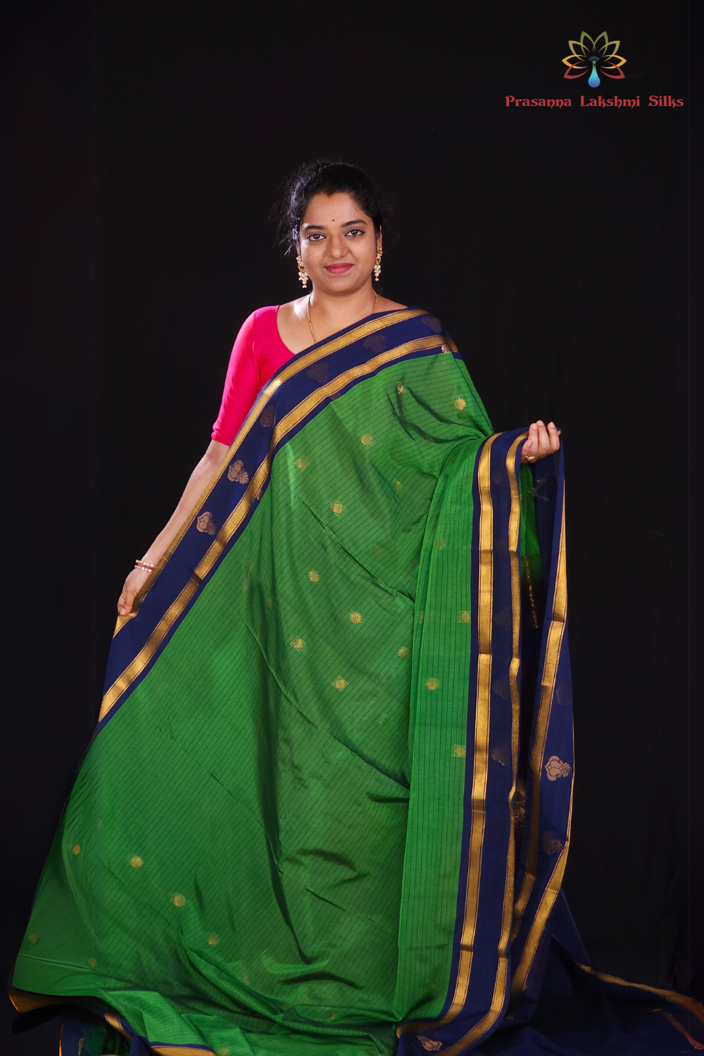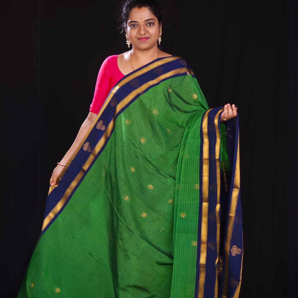 Experience the grandeur of semi-Gadwal saree featuring horizontal stripes with zari woven motifs, zari-woven gap borders, and a rich brocade pallu. Paired with contrast blouse.....