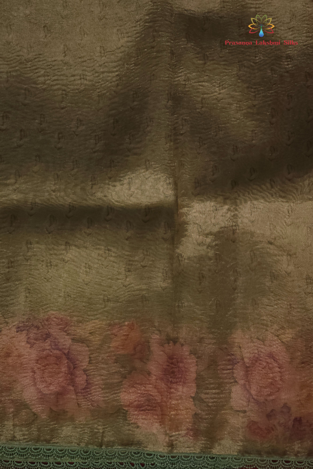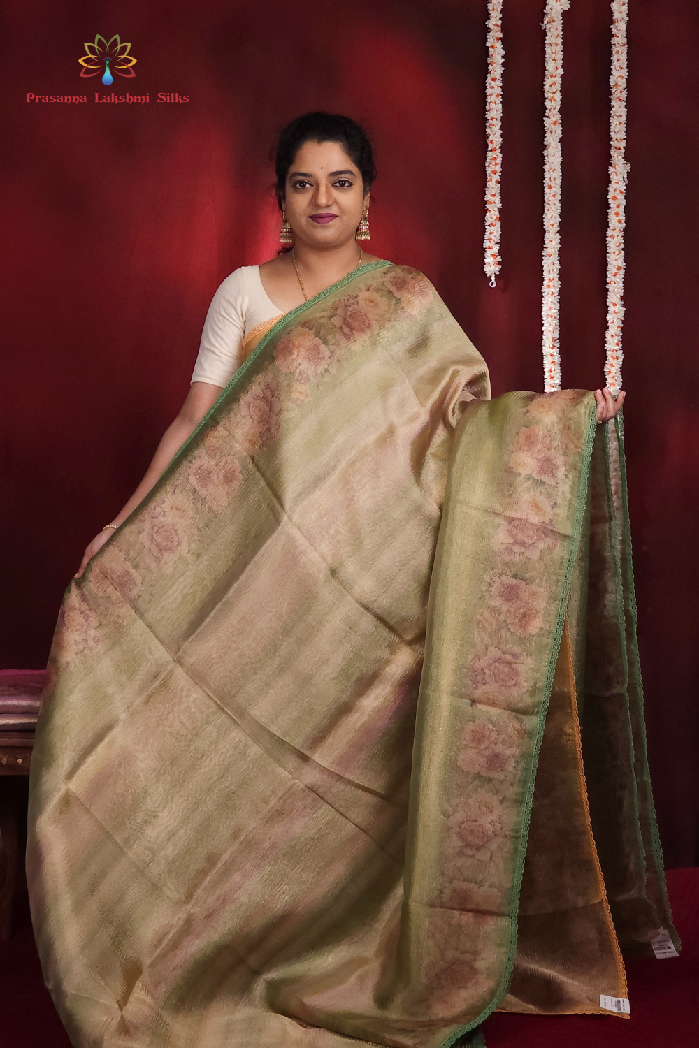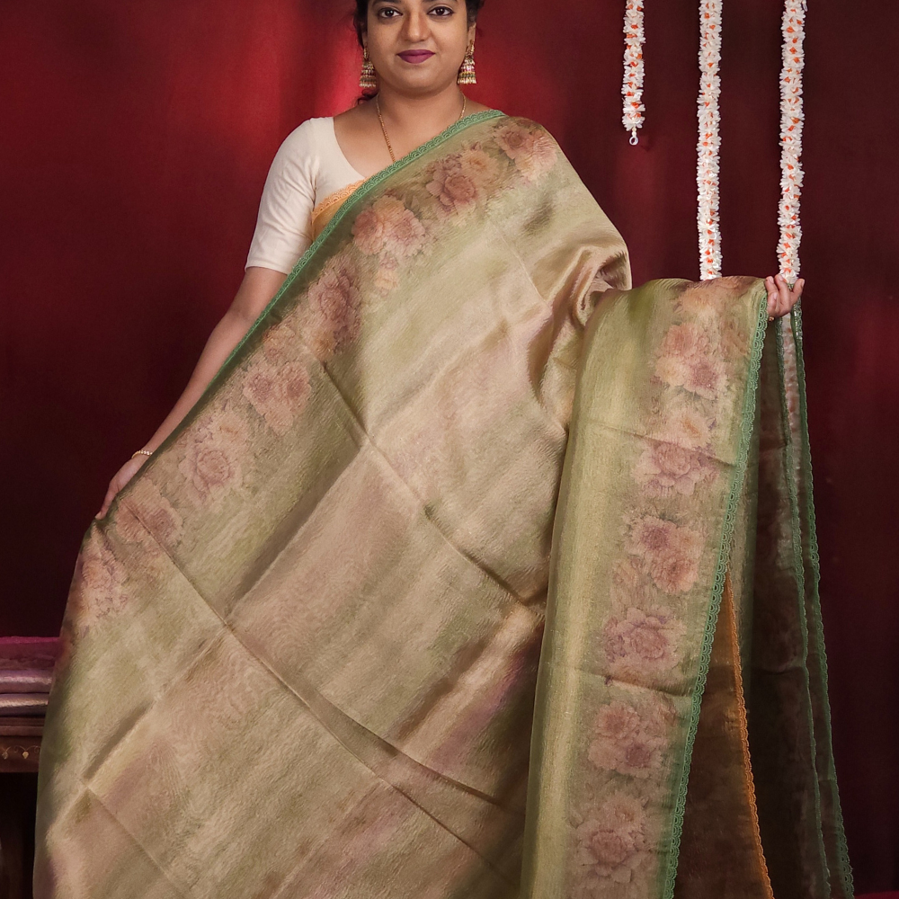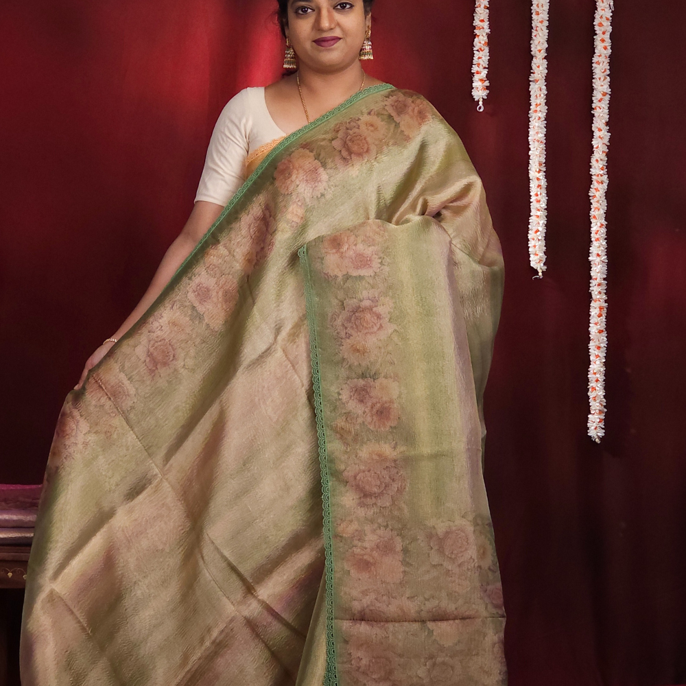 Multi colour Crush Tissue Saree with unique Digital print borders ,dainty lace detailing Rich pallu and Digital pint Blouse.....