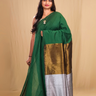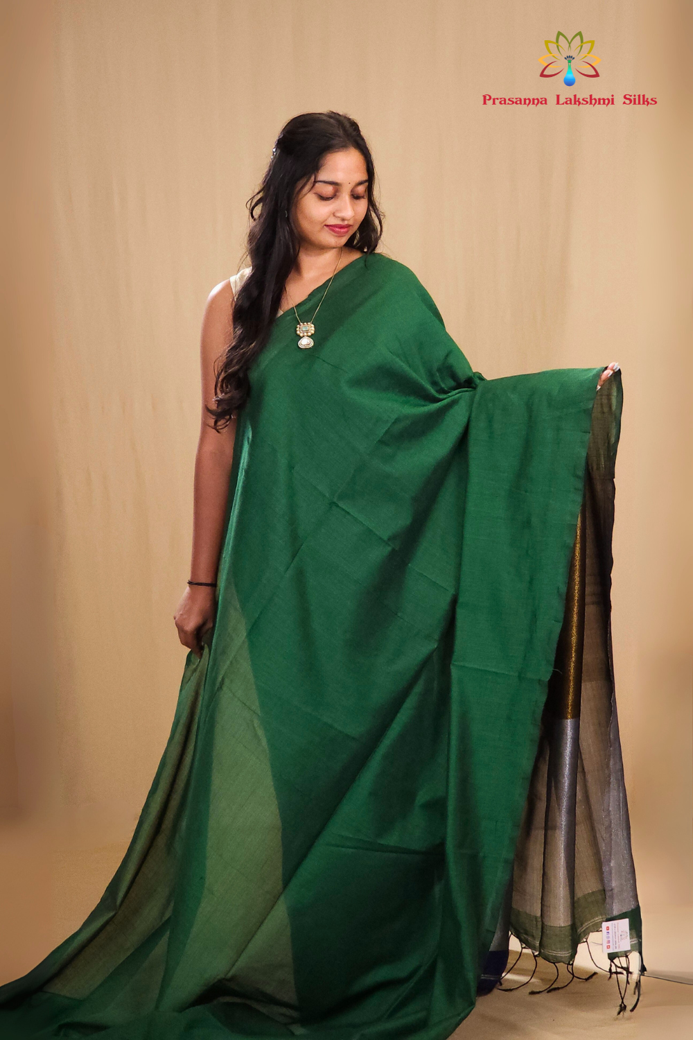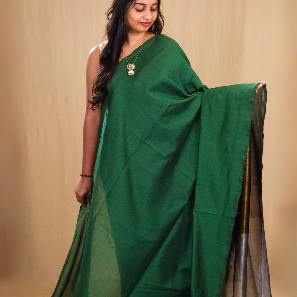 Discover the elegance of our Khadi Cotton Saree, featuring a plain body paired with contrast gold & silver pallu finished with tassels paired with a running blouse.....