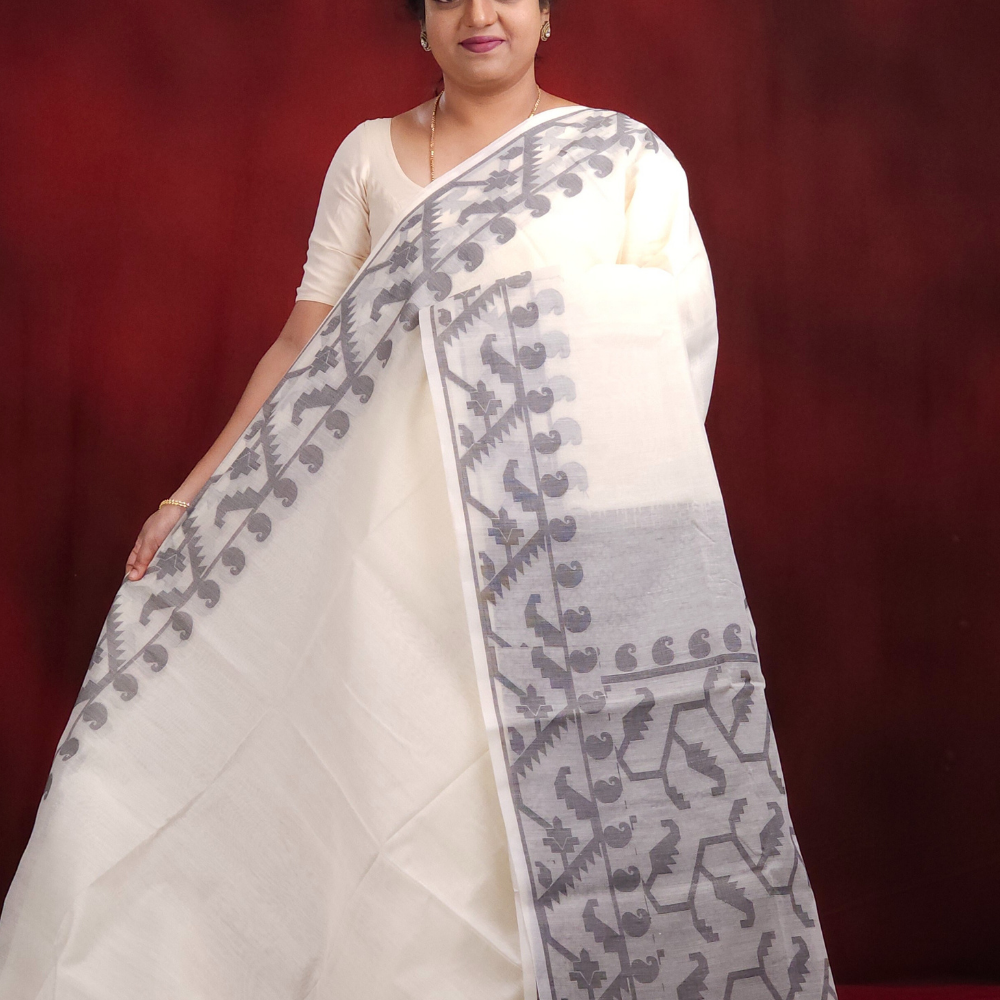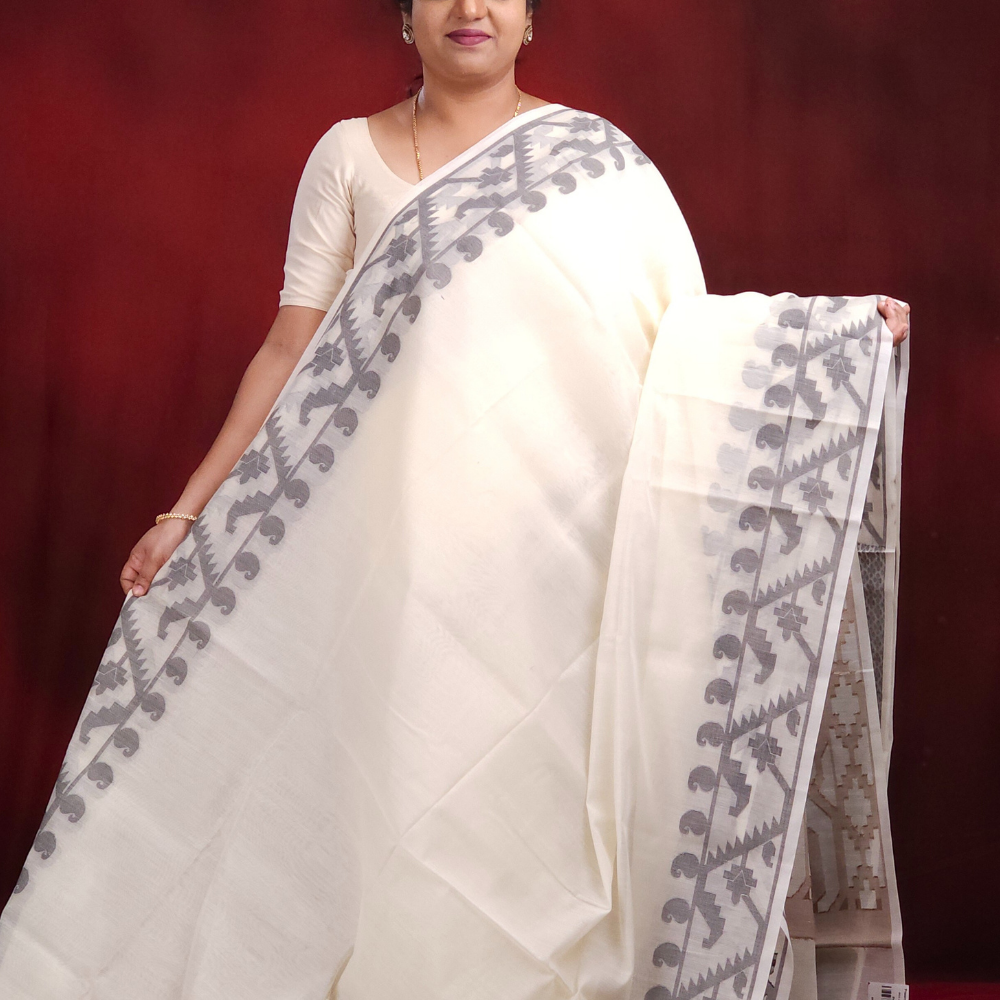 Cream and Black Semi Muslin Sarees