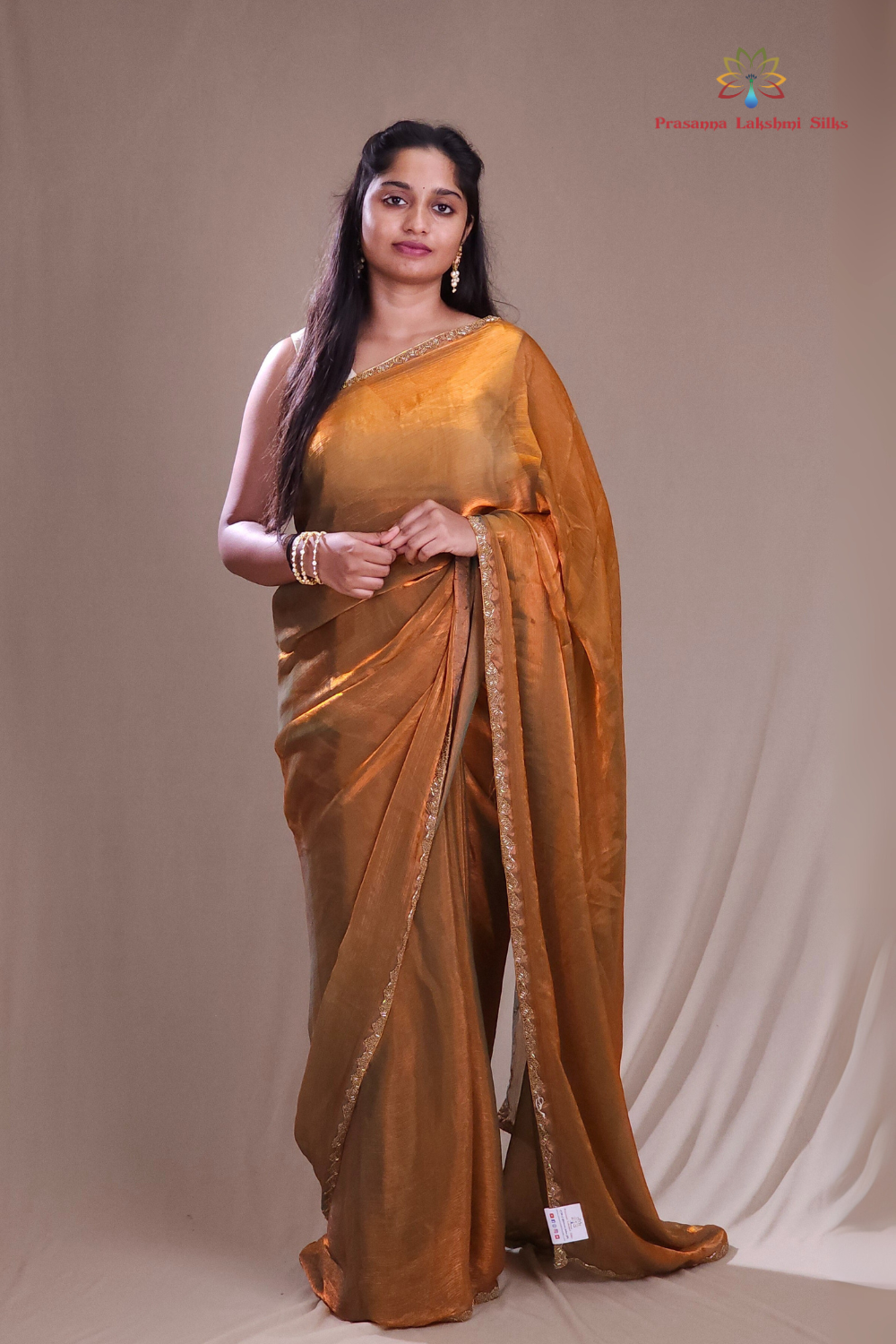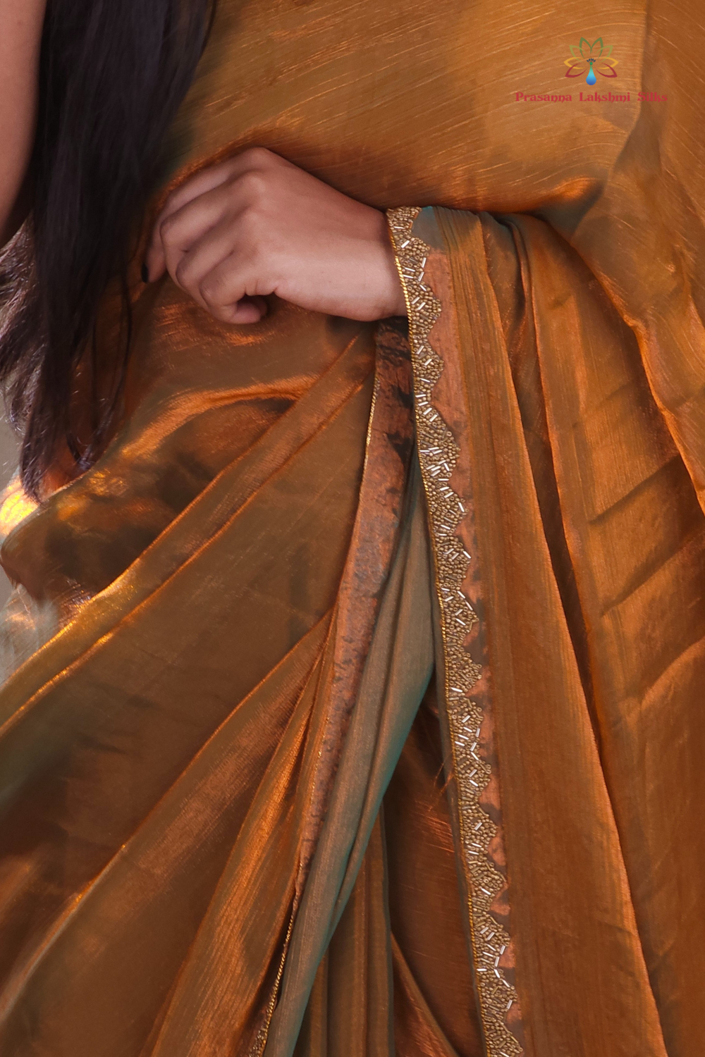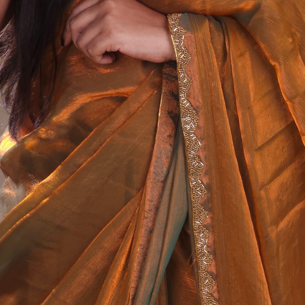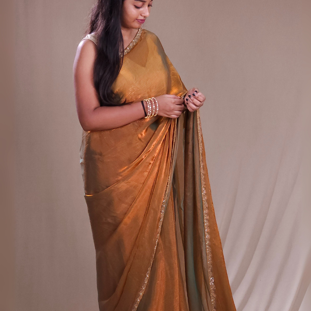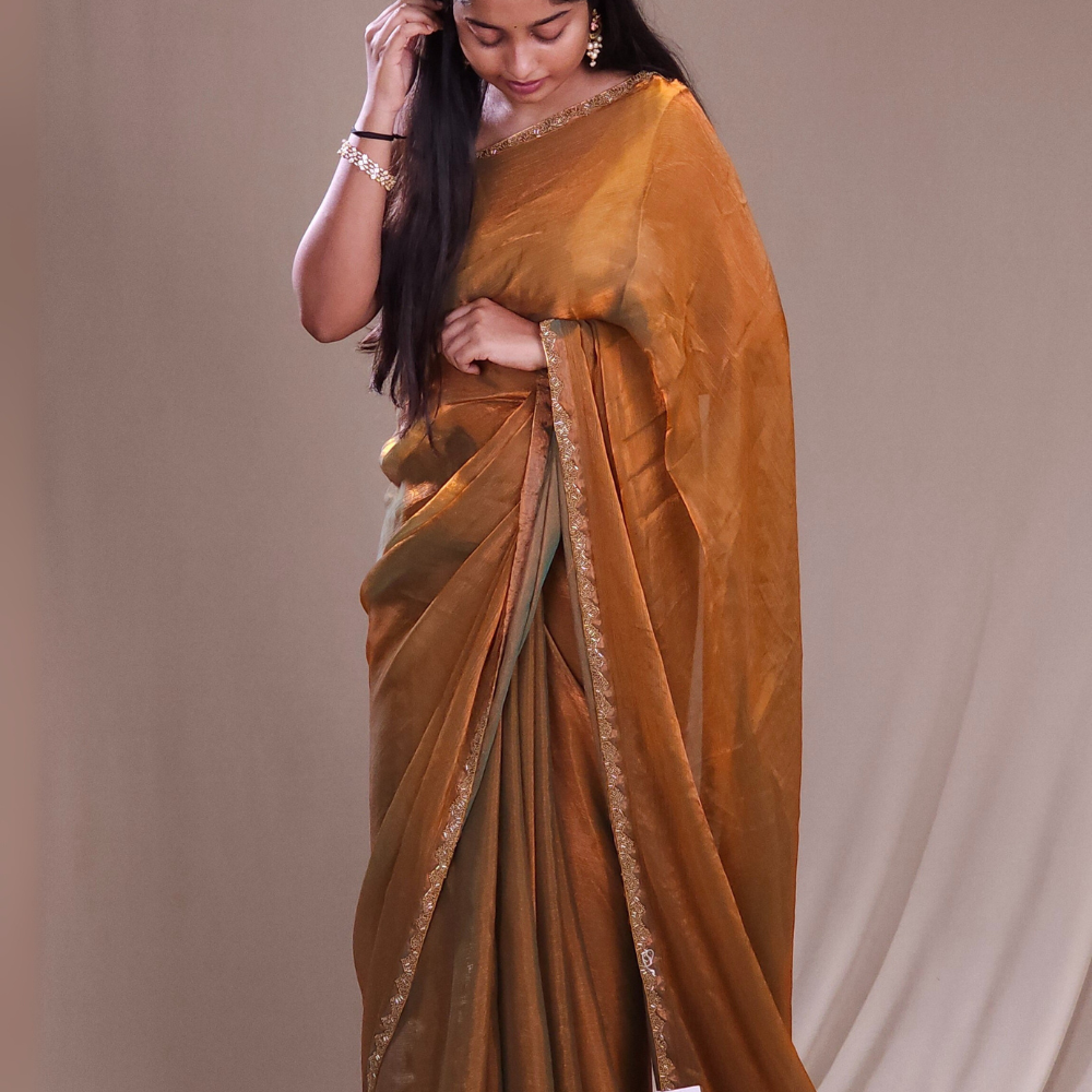 Drape yourself in sheer elegance with our Fendy Chiffon Saree, Featuring beautiful antique beadwork on the borders and pallu, this saree adds a subtle sparkle to your look. Lightweight and graceful, paired with a running blouse......