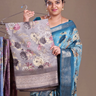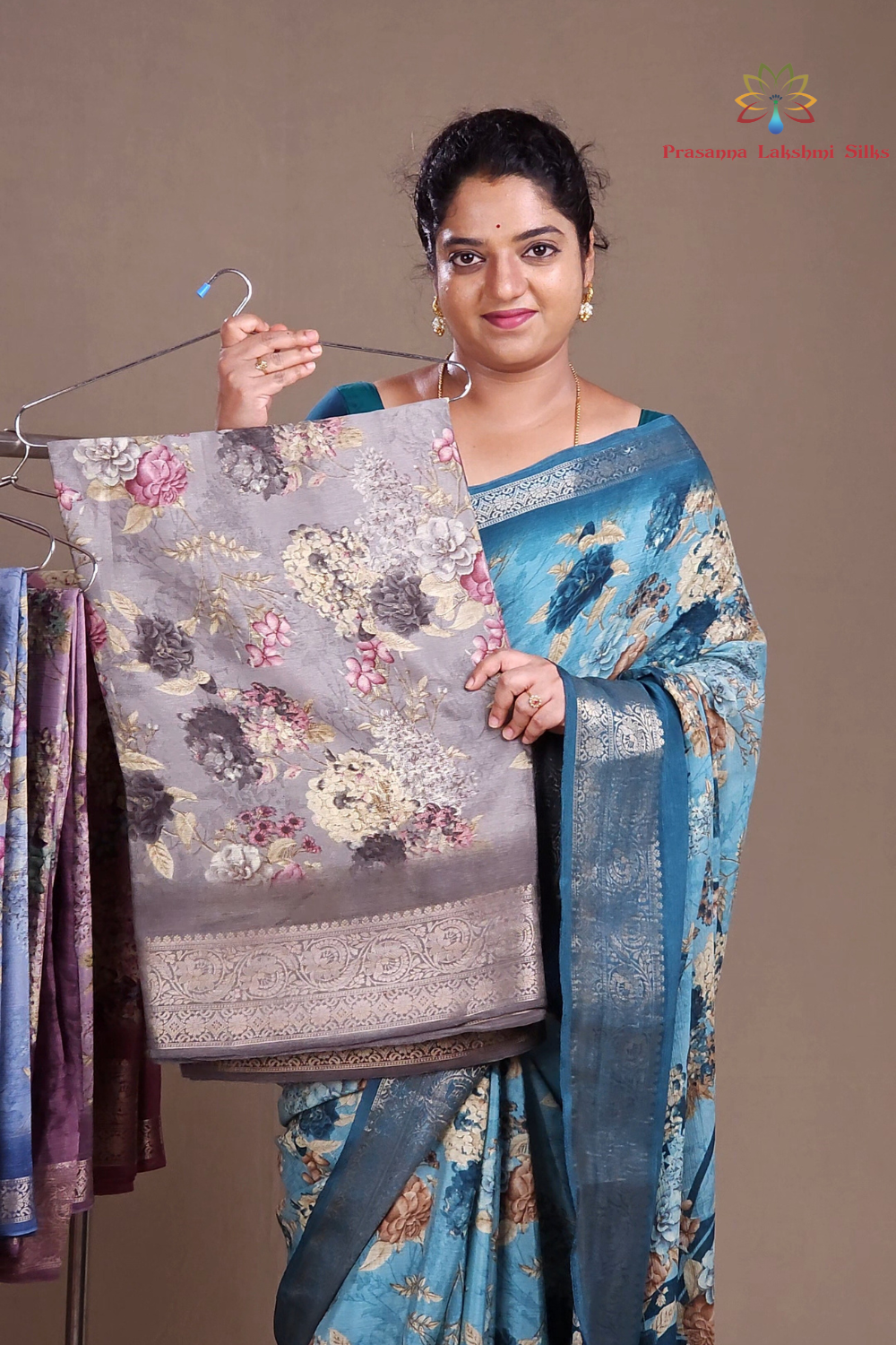 Beautiful Wrinkle shiffon saree allover floral digital print straight lines pallu zari borders anddigital print blouse