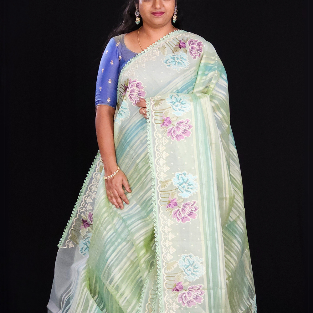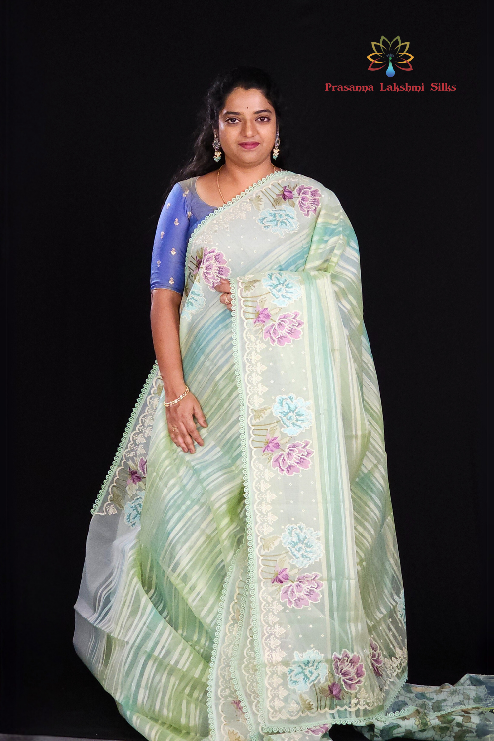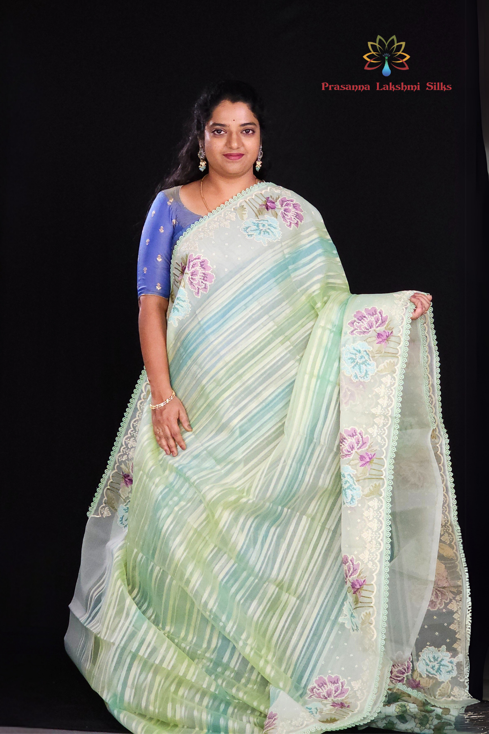 Elevate your style with our stunning Organza Saree Allover horizantal lines , unique embroidery borders with one inch lace detailing and pallu paired with running Digital print Blouse