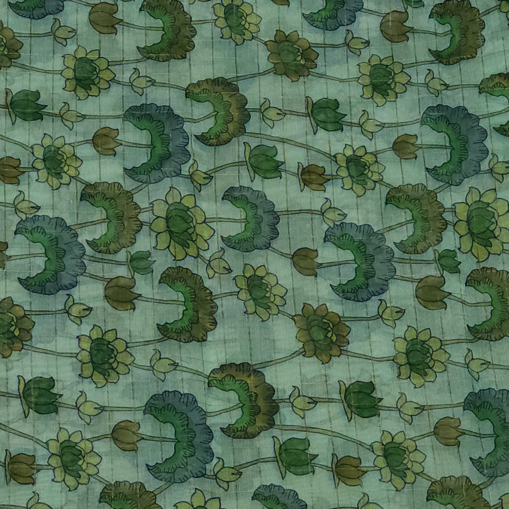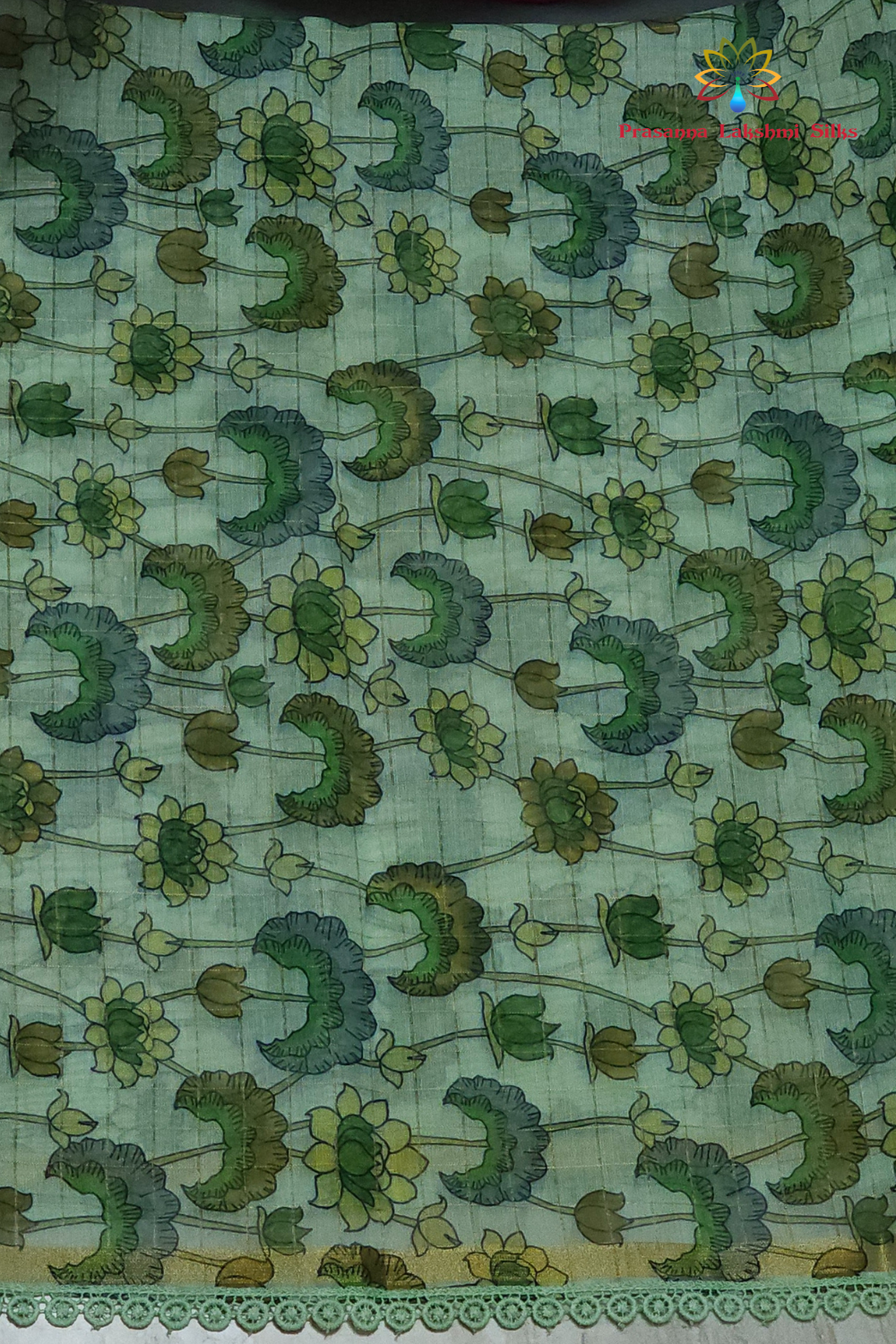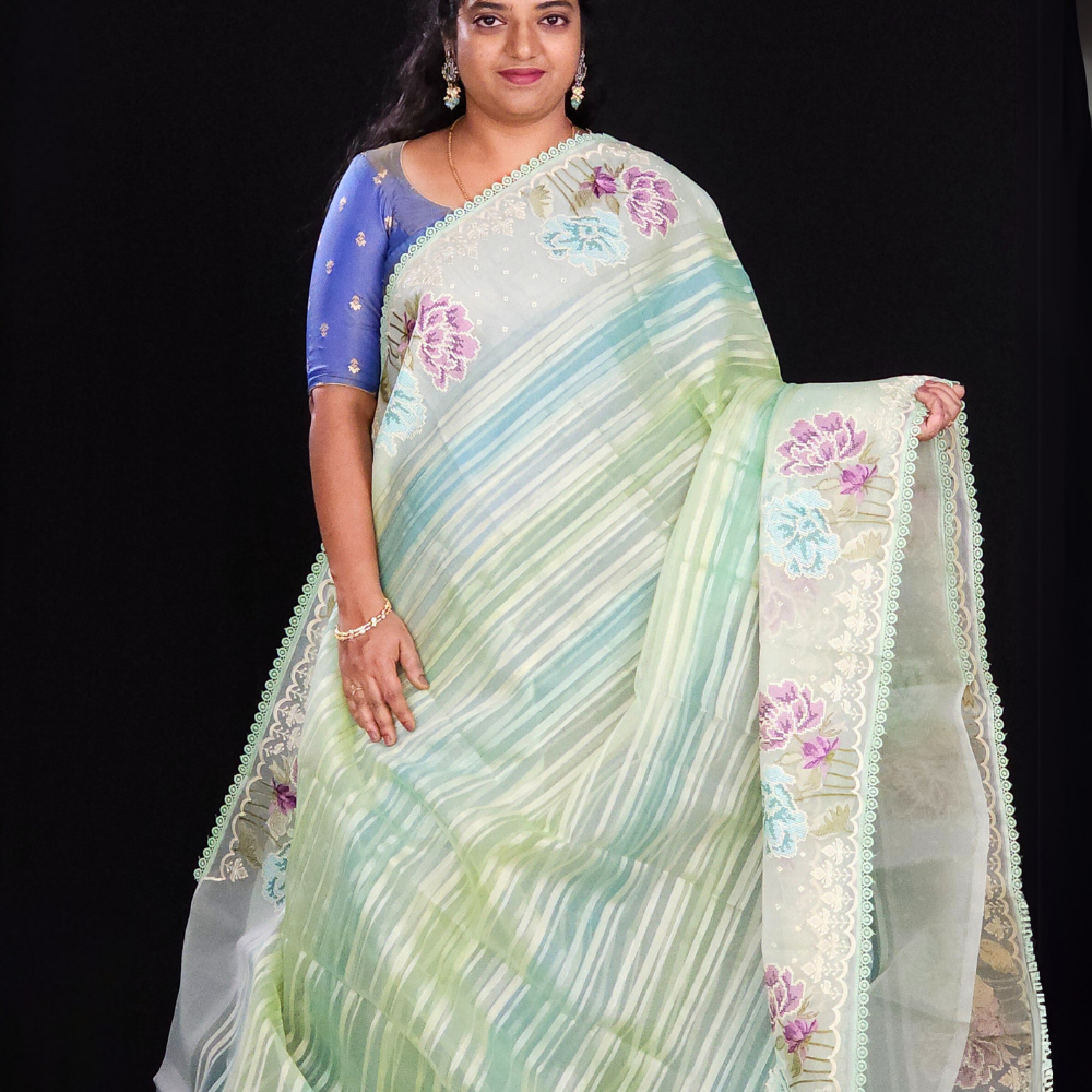 Elevate your style with our stunning Organza Saree Allover horizantal lines , unique embroidery borders with one inch lace detailing and pallu paired with running Digital print Blouse