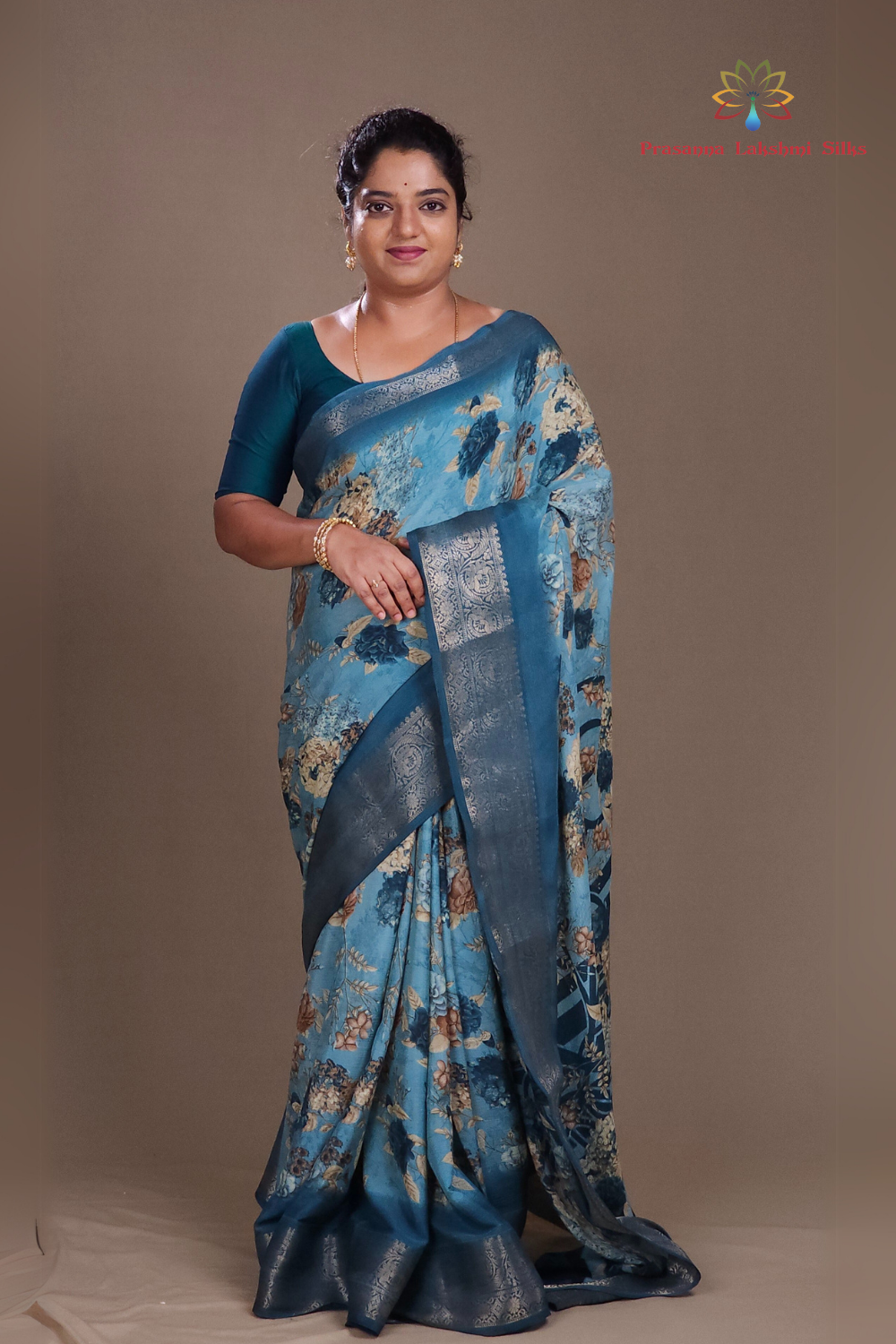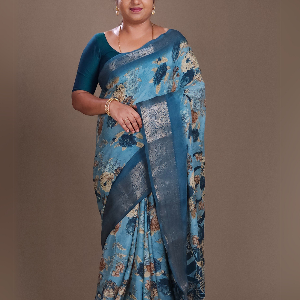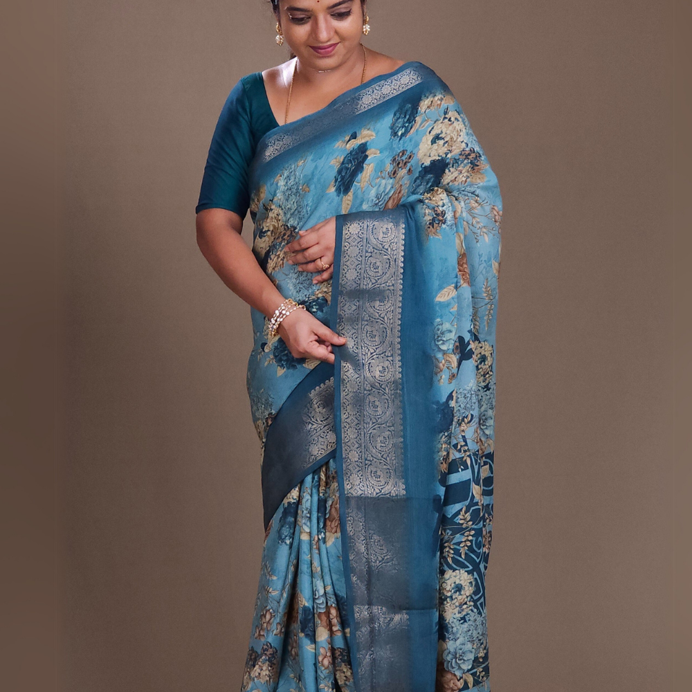 Beautiful Wrinkle shiffon saree allover floral digital print straight lines pallu zari borders anddigital print blouse