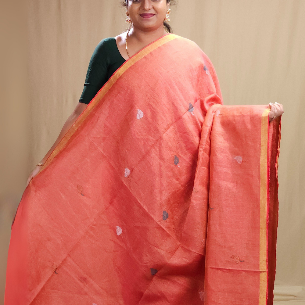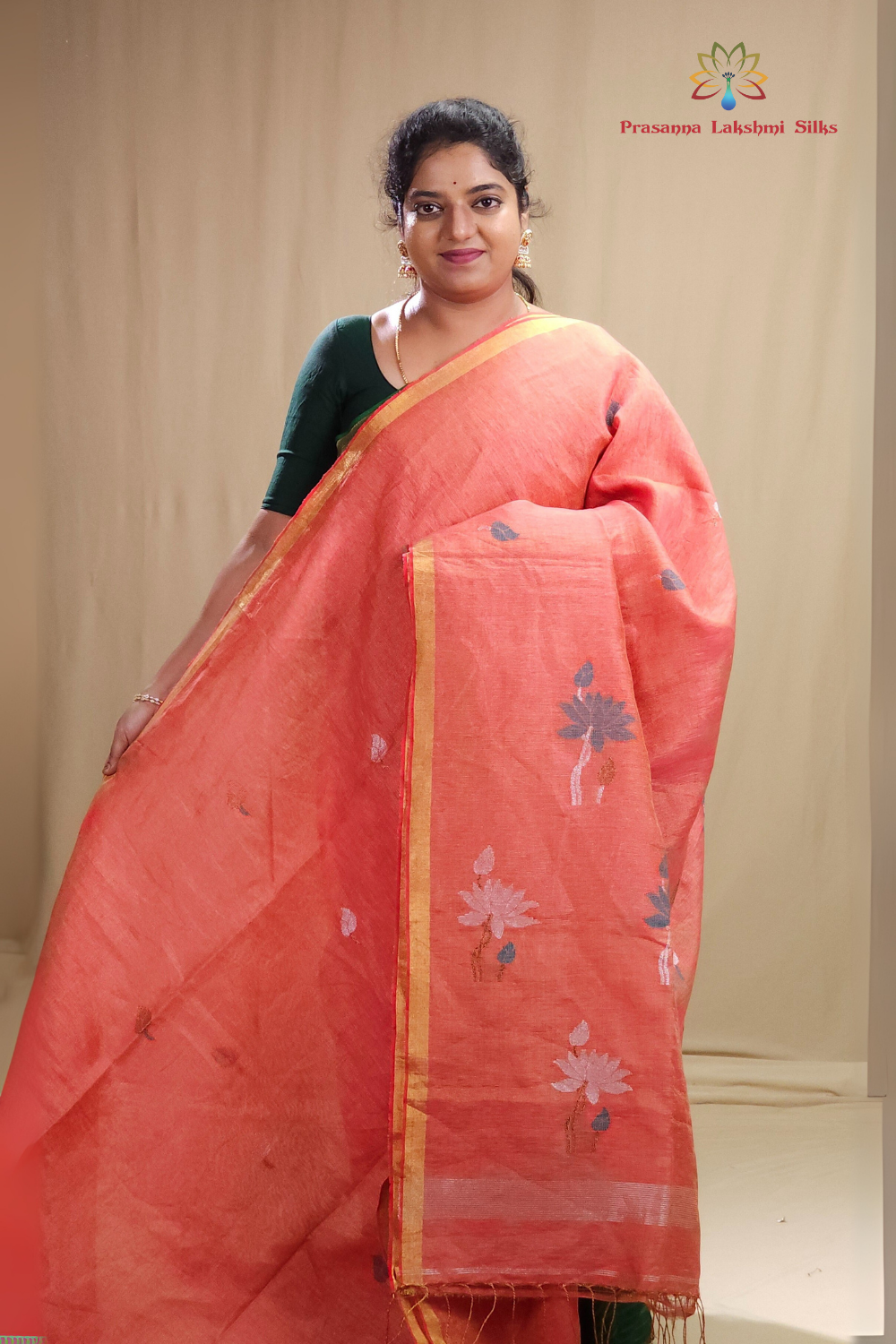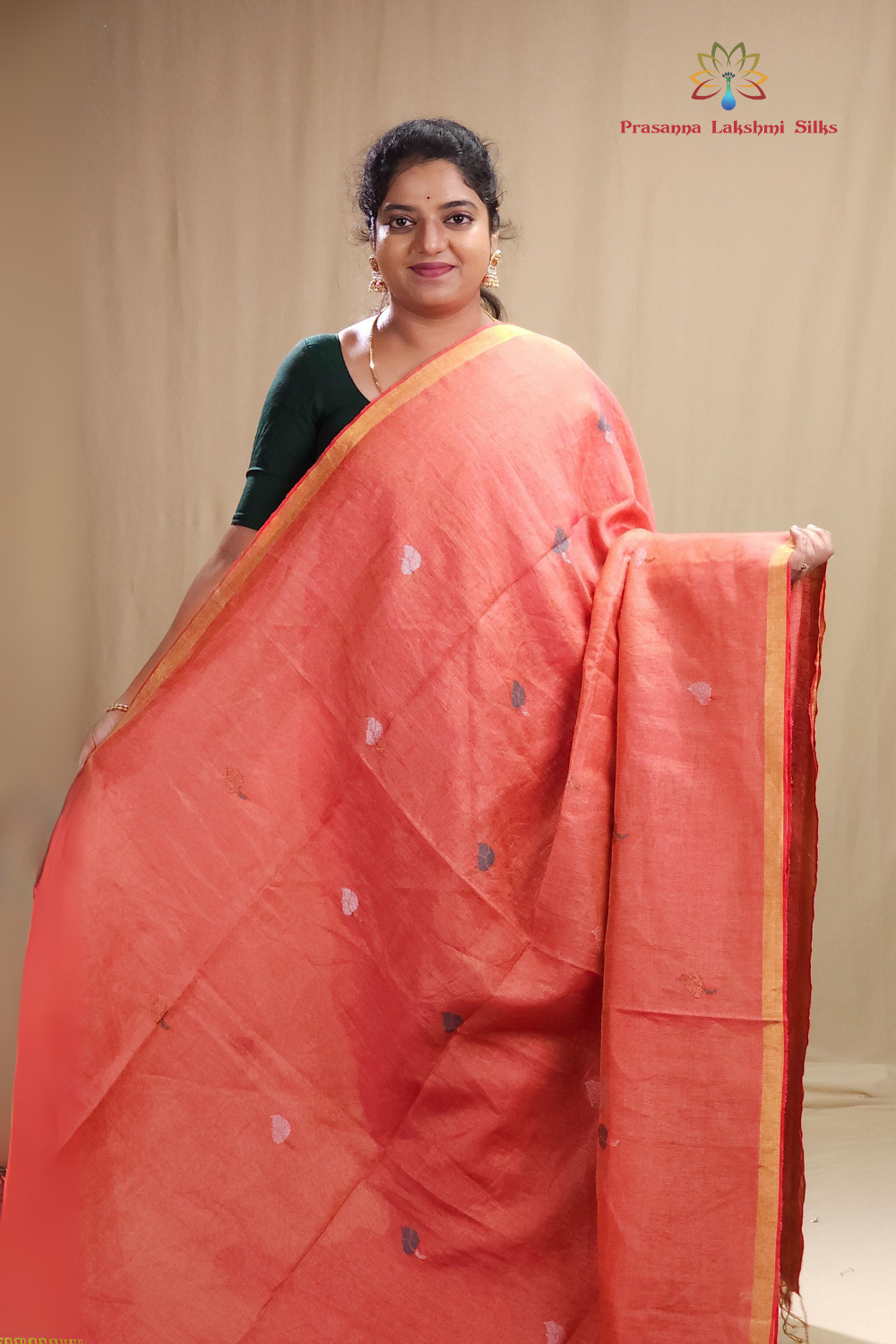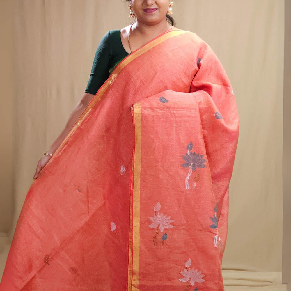 Exquisite Pure Linen Tissues Sarees featuring intricate Jamdhani floral motifs all over the body, with subtle Meenakari detailing for a touch of elegance. A sleek 1-inch zari border with rich Floral pallu paired with a running blouse for a complete graceful look.....
