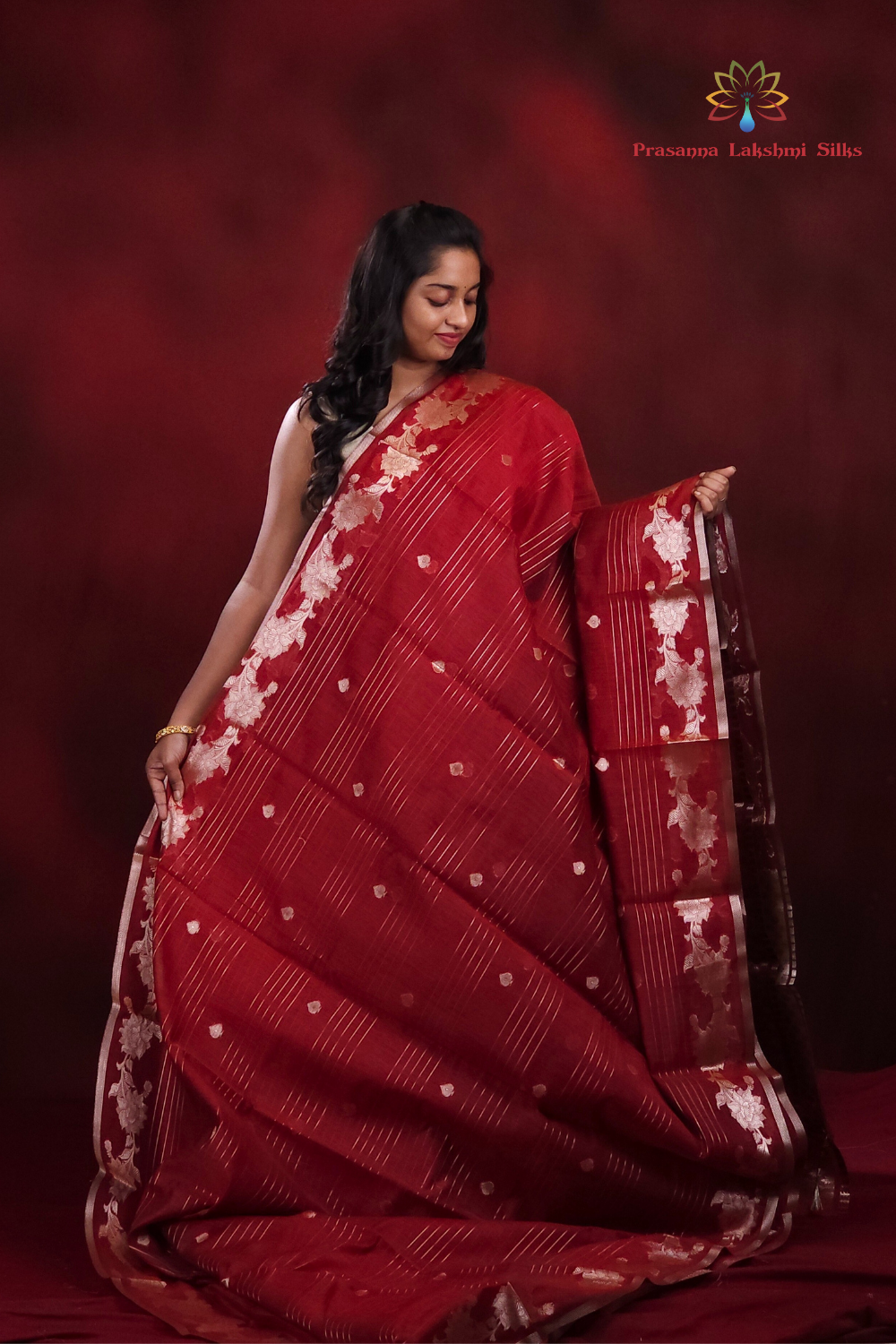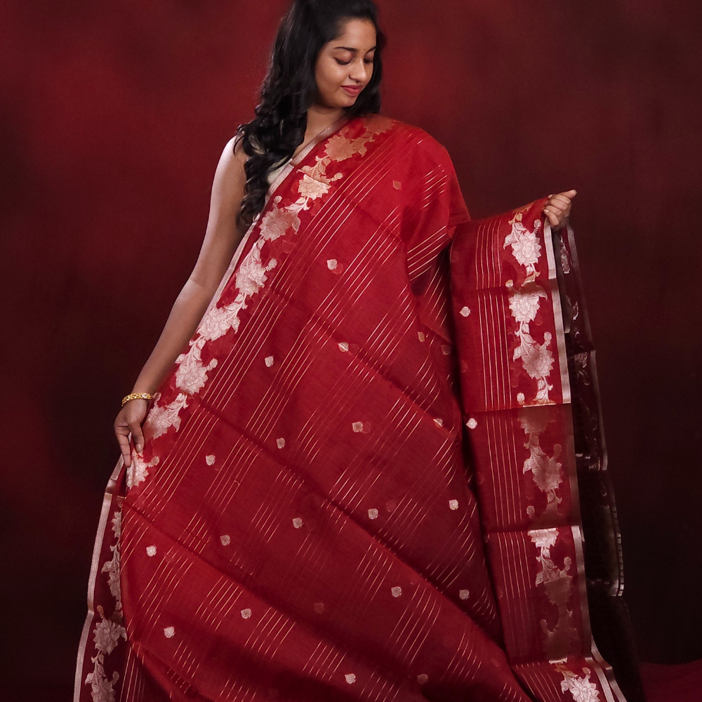 Beautiful Chanderi Saree, featuring allover horizontal zari stripes designed with a unique floral border detailing zari stripes pallu,and a running blouse
