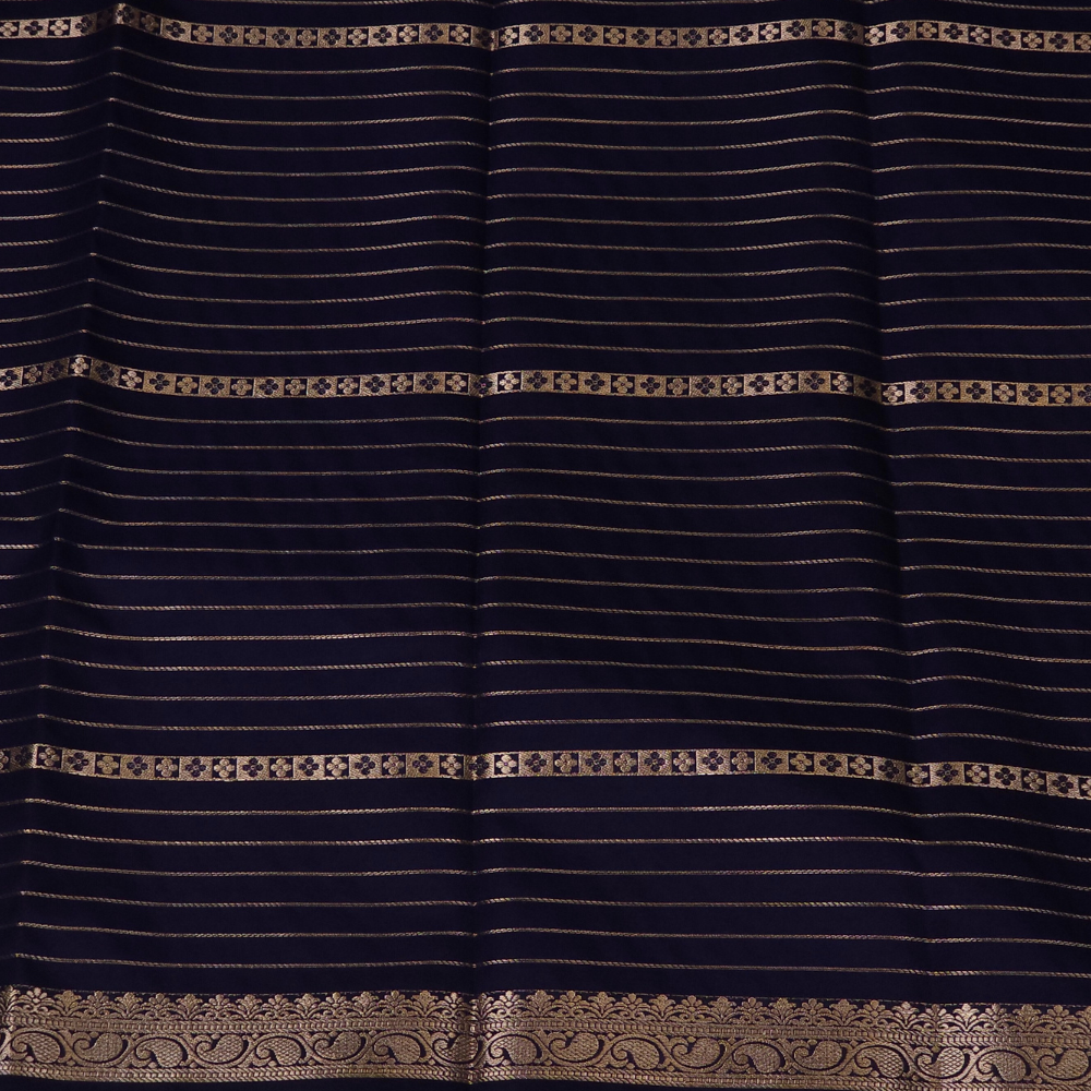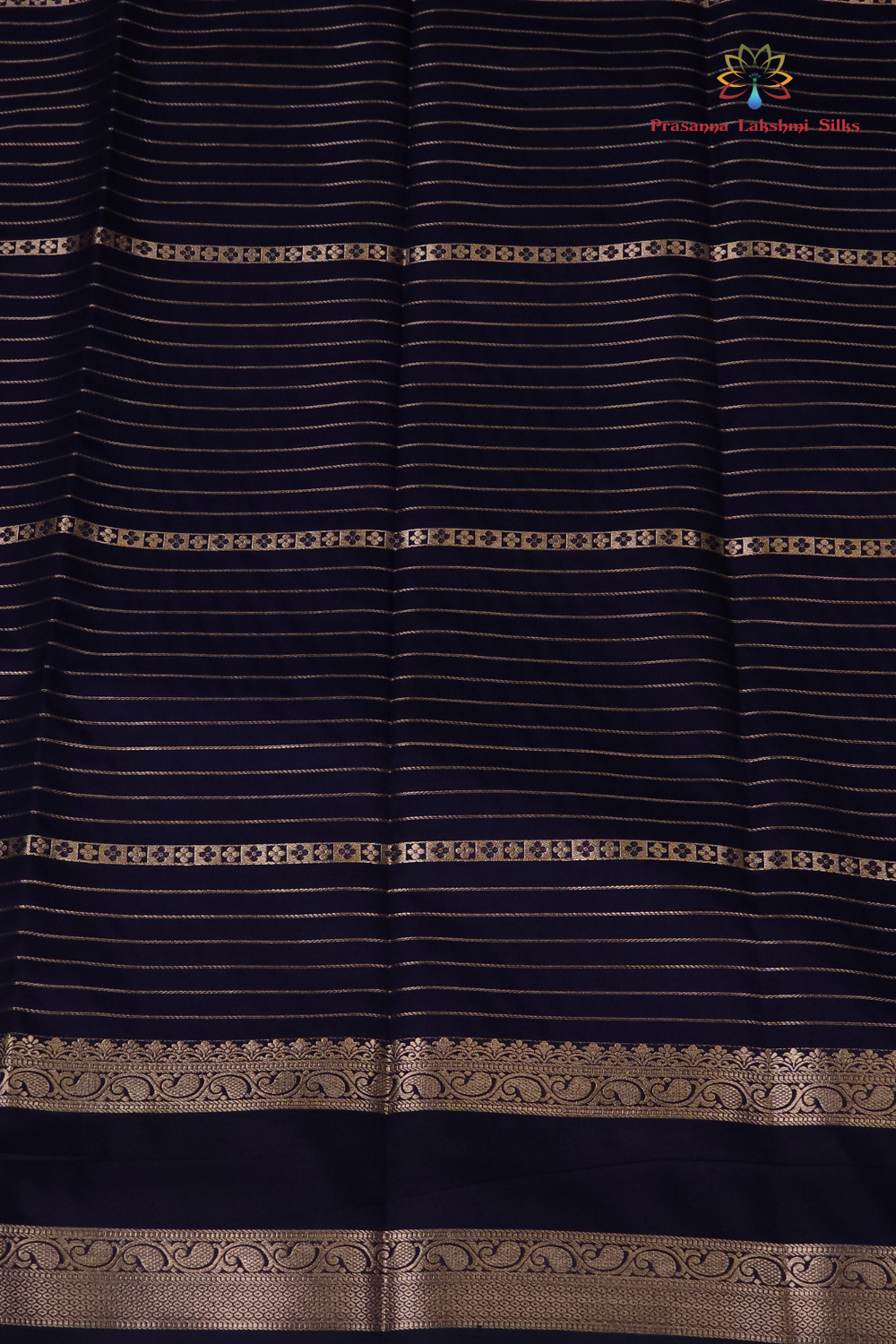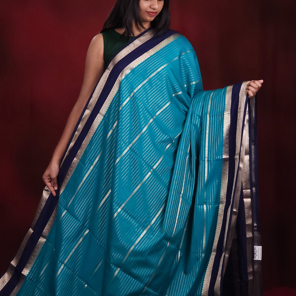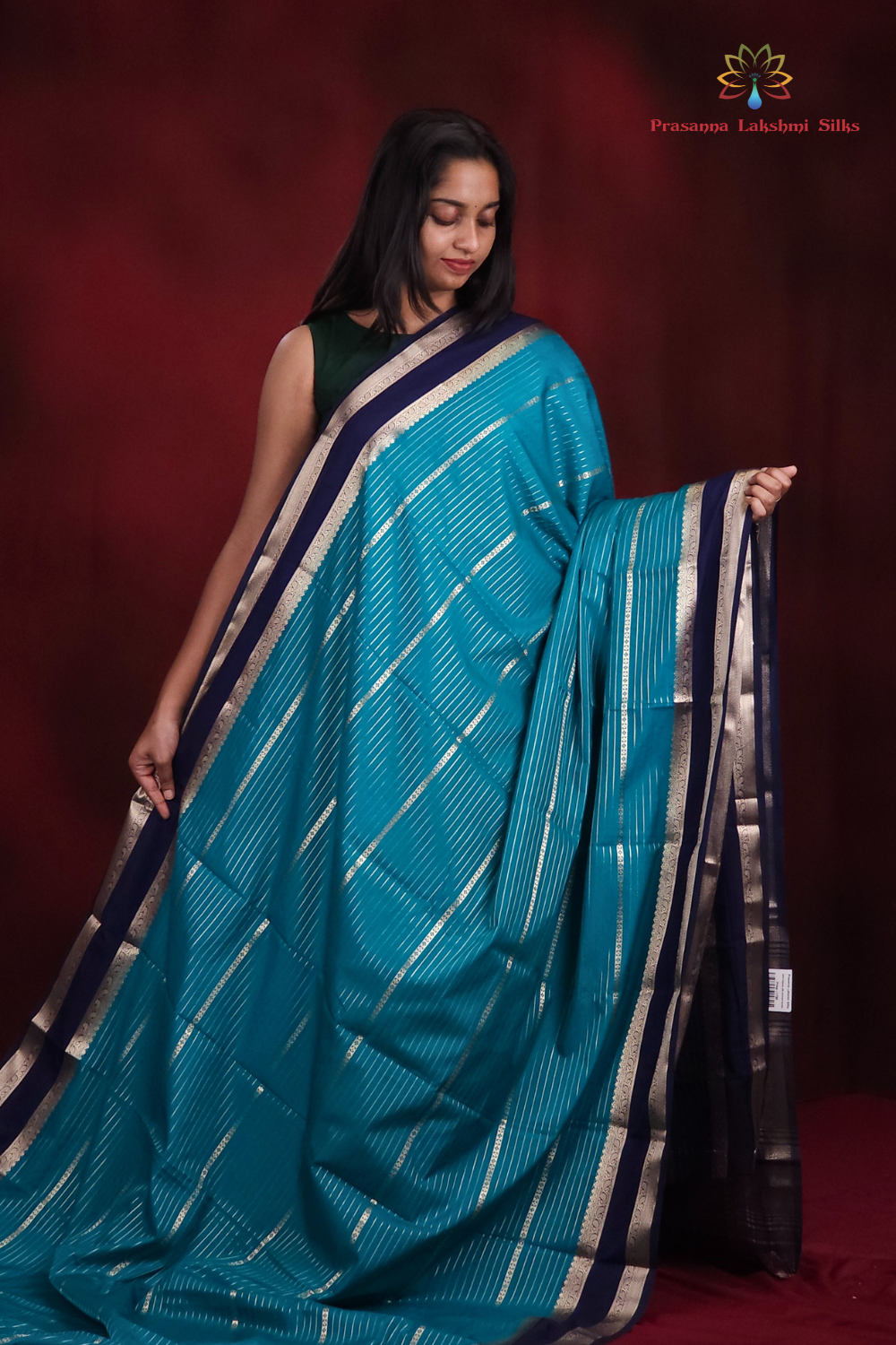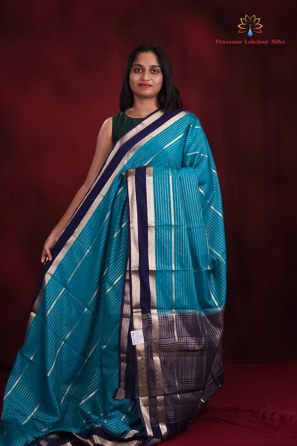 Experience the richness of Semi Mysore silk saree with zari woven stripes all over the saree, complemented by contrast gap borders, paired with contrast tissue stripe pallu and contrast blouse with zari woven motifs.....