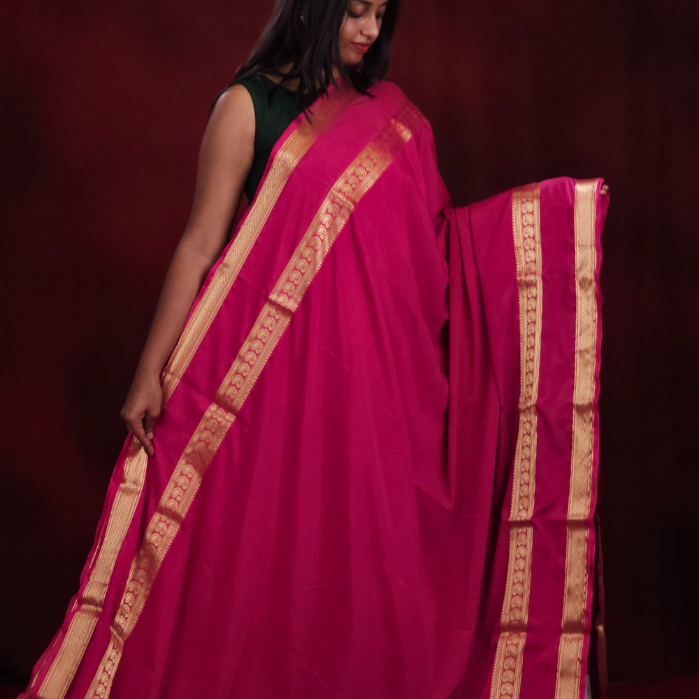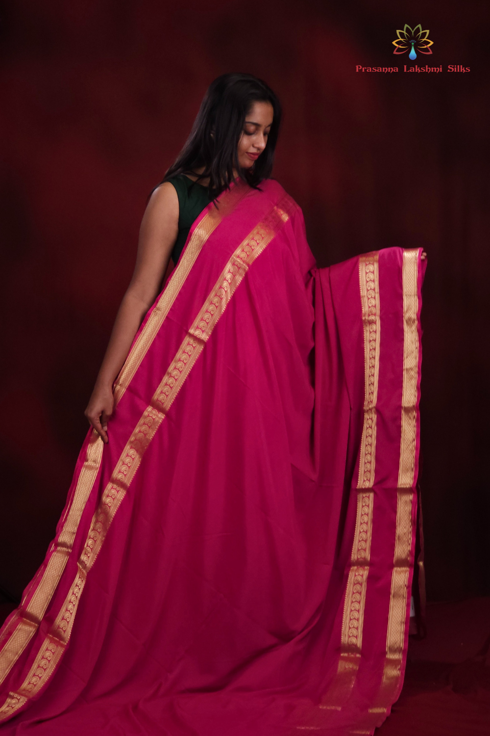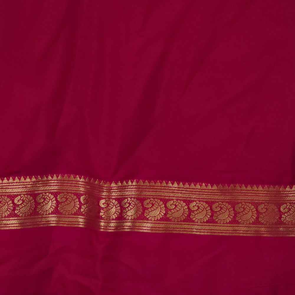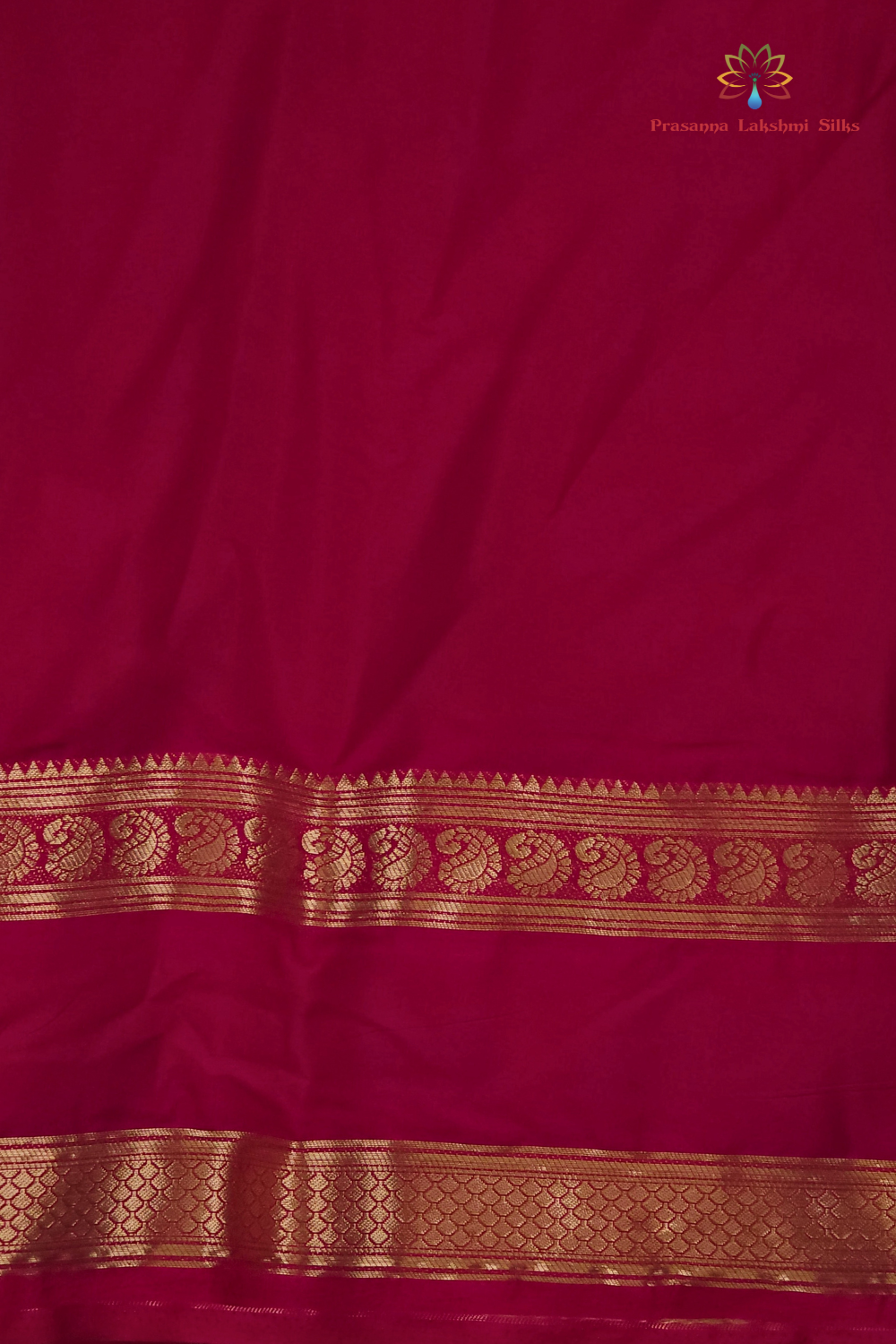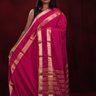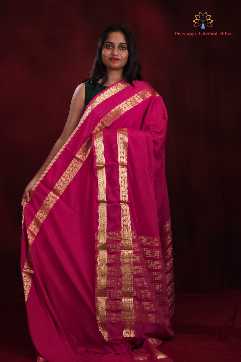 Experience the richness of Semi Mysore silk saree with contrast zari woven gap borders, paired with stripe pallu and running blouse....