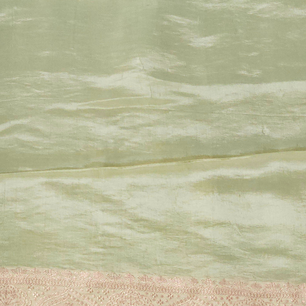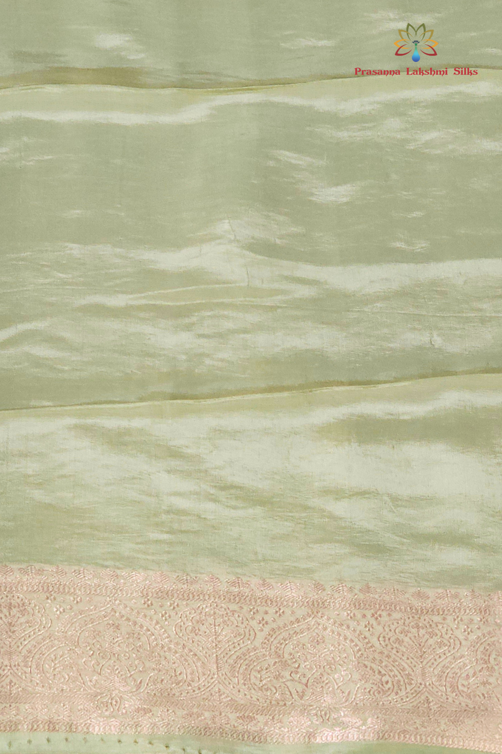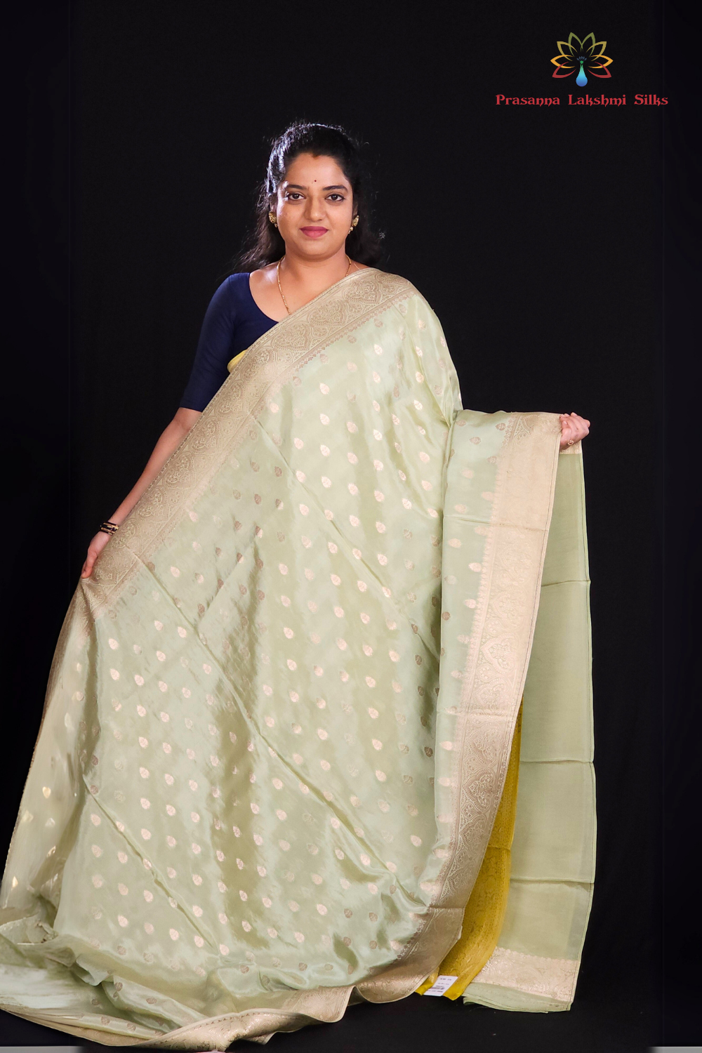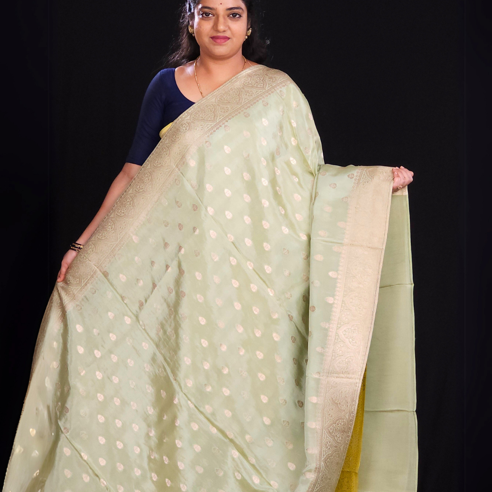 Wrap yourself in the opulence of our Banaras Munga Tissue Saree, with zari woven motifs and floral borders rich brocade pallu . Paired with a running blouse