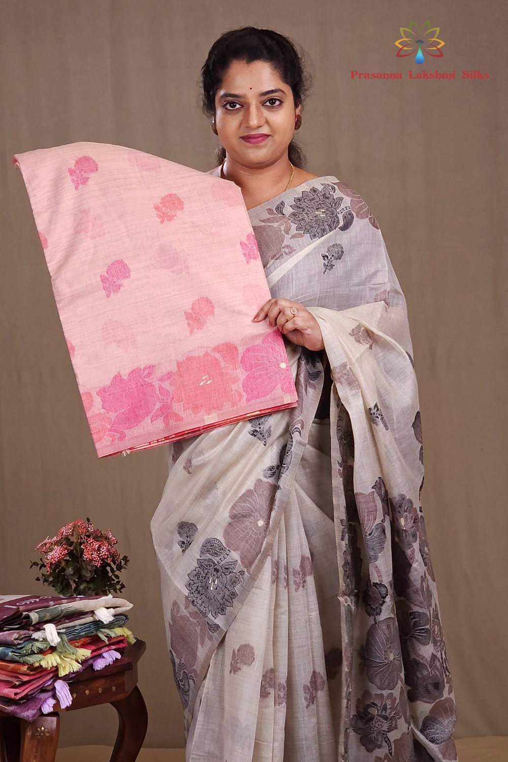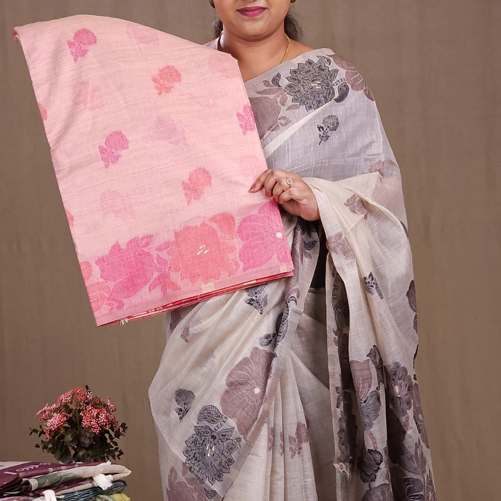 Experience the elegance of our Chanderi silk cotton saree, allover floral and zari buttas with Contrast big floral bunches pallu with tassels paired with contrast blouse....