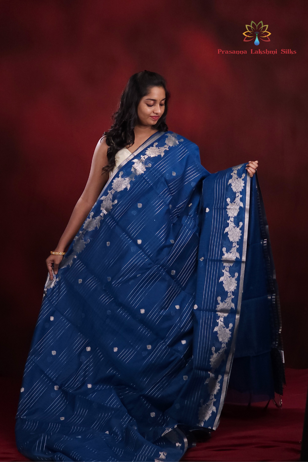 Beautiful Chanderi Saree, featuring allover horizontal zari stripes designed with a unique floral border detailing zari stripes pallu,and a running blouse