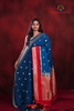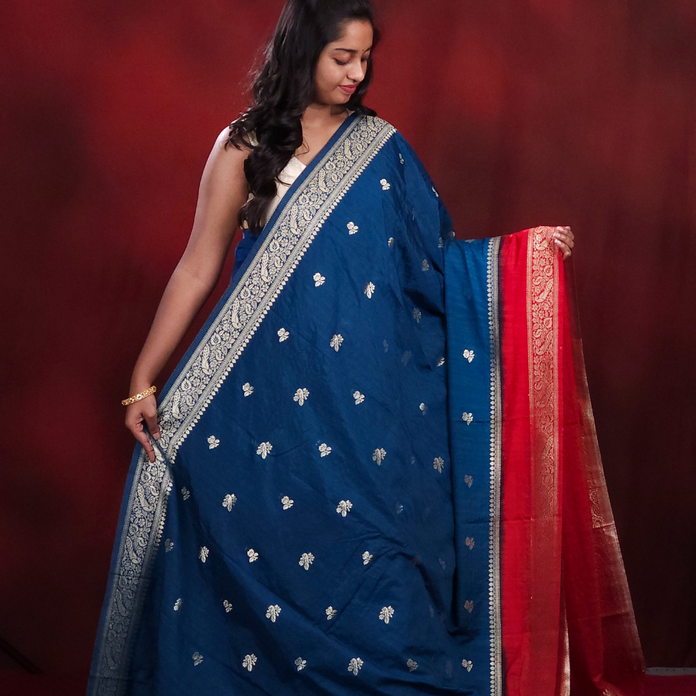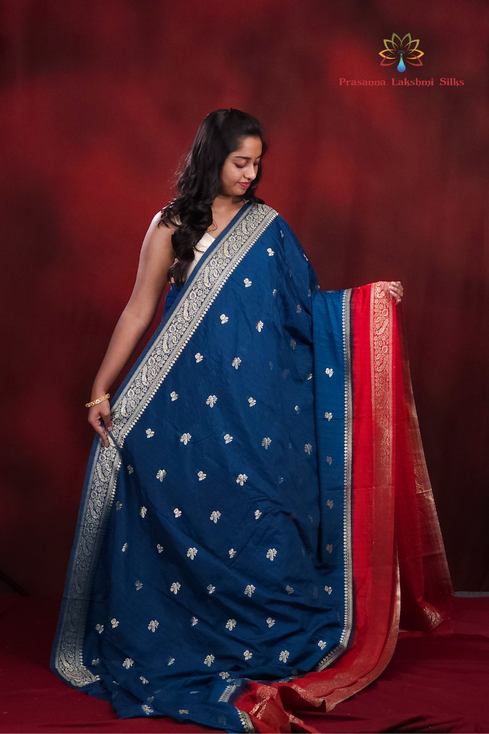 Experience the richness of Semi dupion saree allover small floral zari woven motifs with contrast zari woven gap borders, paired with stripe pallu and running blouse....