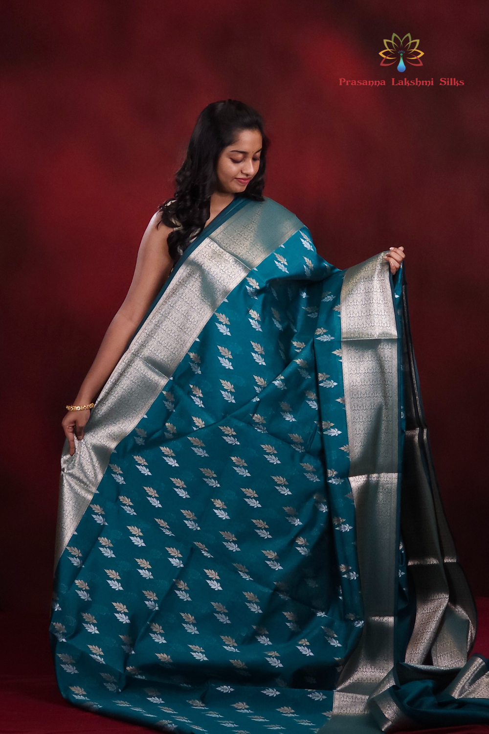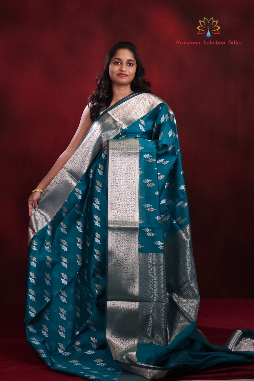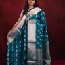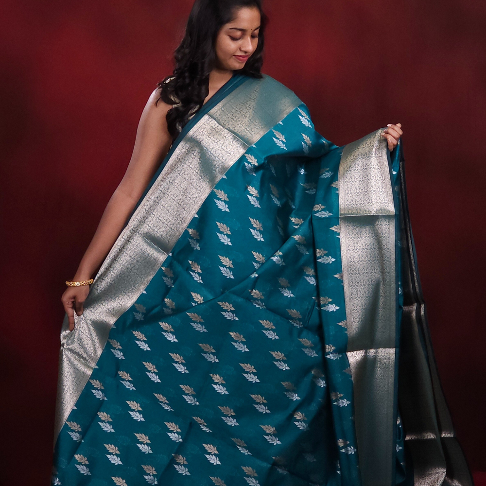 Elegant Banaras silk cotton sarees featuring allover leaf motifs woven in alternate gold and silver zari paired with antique zari woven borders and a rich floral brocade pallu, paired with a running blouse