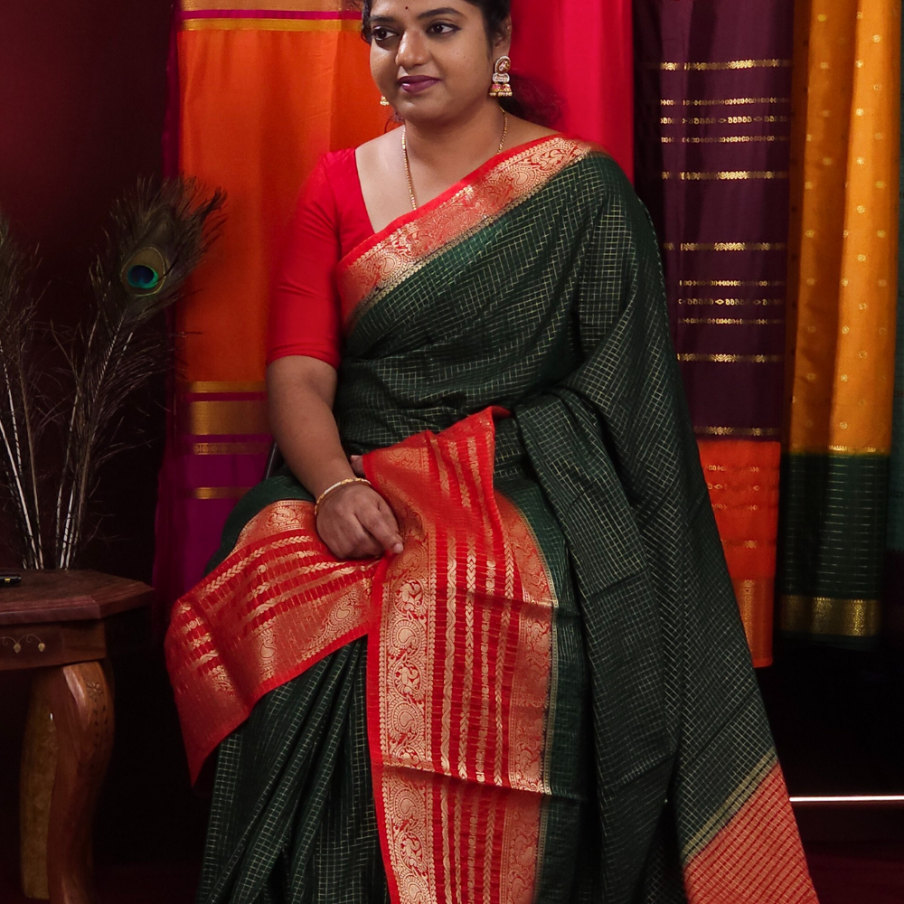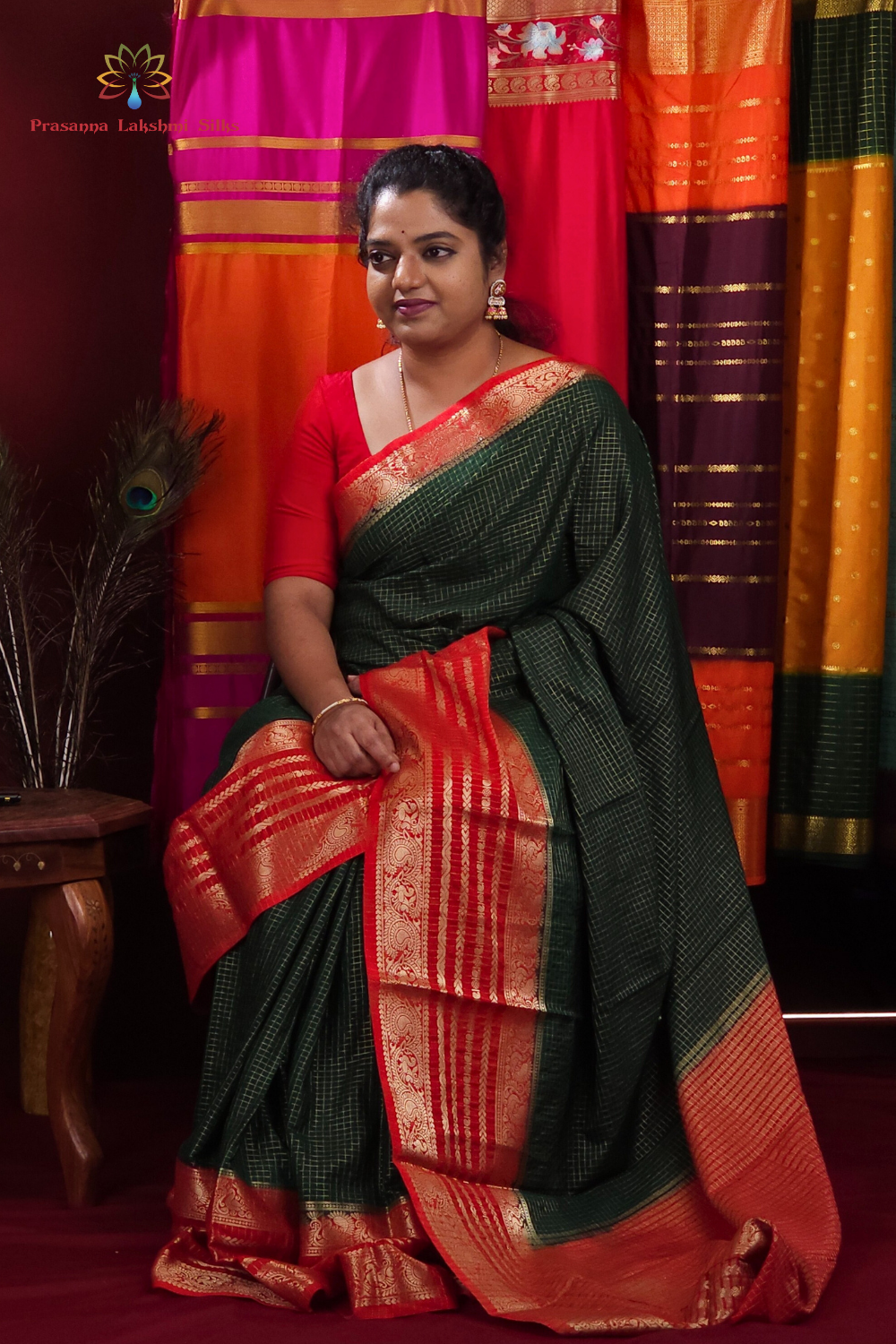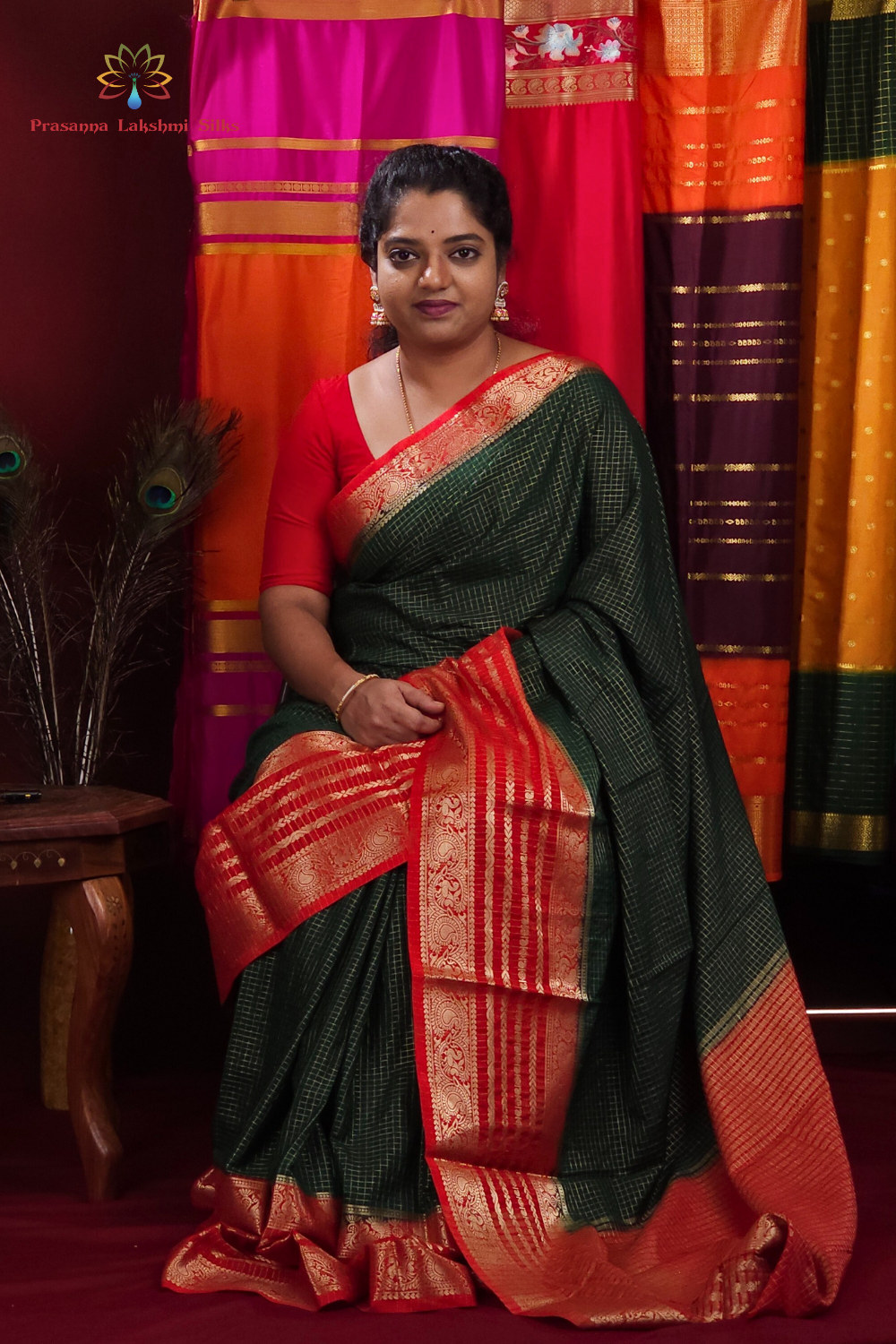 Beautiful Semi Mysore Silk Saree, featuring allover checks designed with a unique border detailing—lower side contrast lines border and a 1-inch contrast border on the upper side,The look is completed with a zari stripes pallu,and a contrast blouse