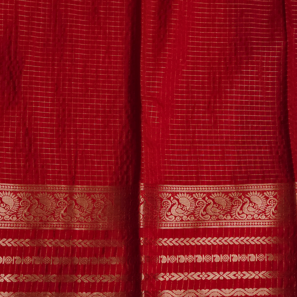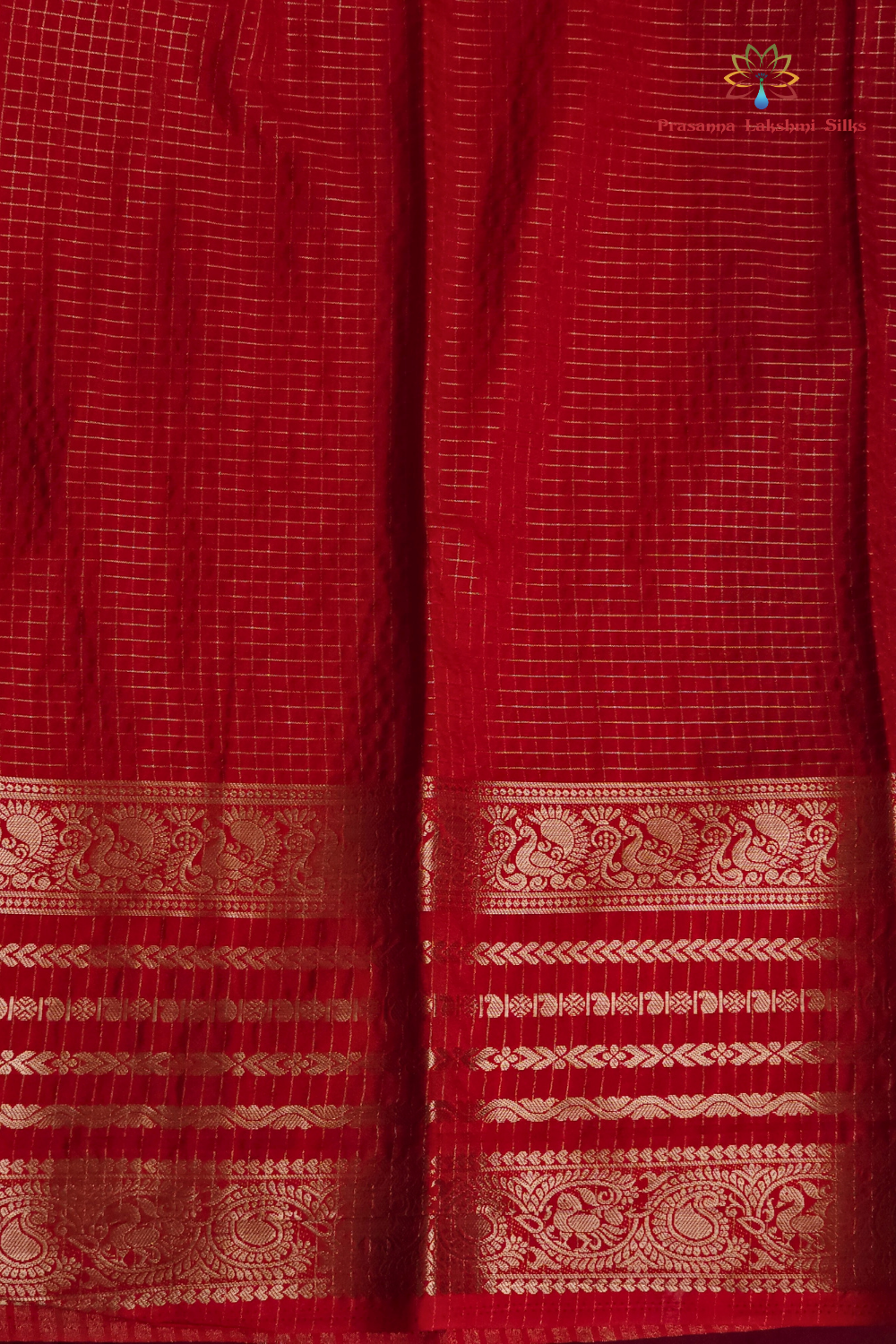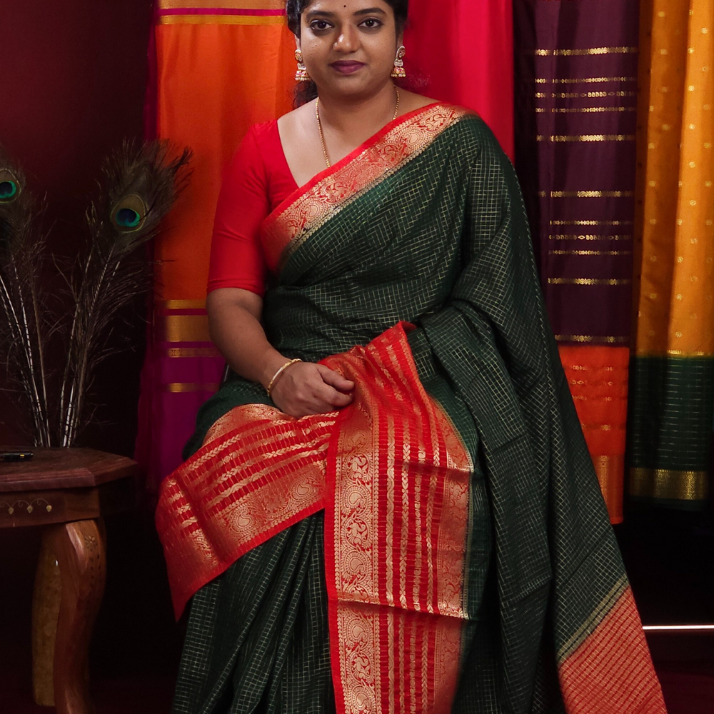 Beautiful Semi Mysore Silk Saree, featuring allover checks designed with a unique border detailing—lower side contrast lines border and a 1-inch contrast border on the upper side,The look is completed with a zari stripes pallu,and a contrast blouse