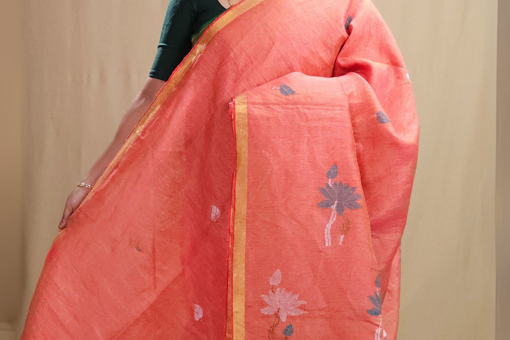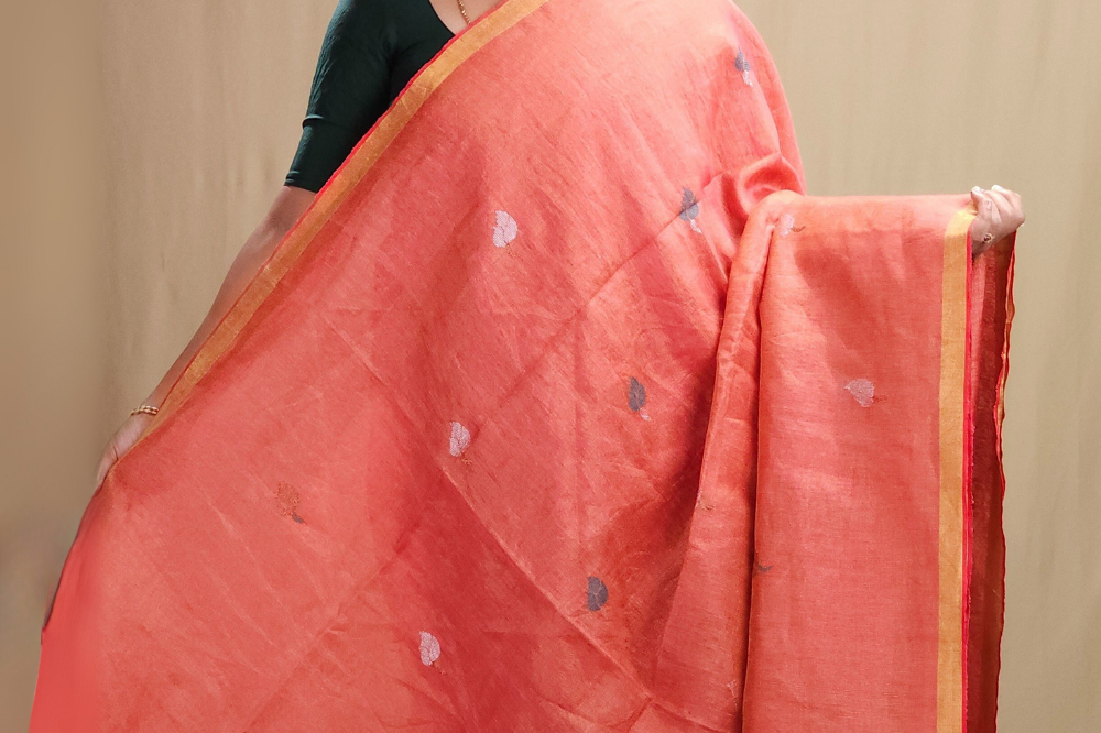 Coral Pink Linen Tissues Sarees