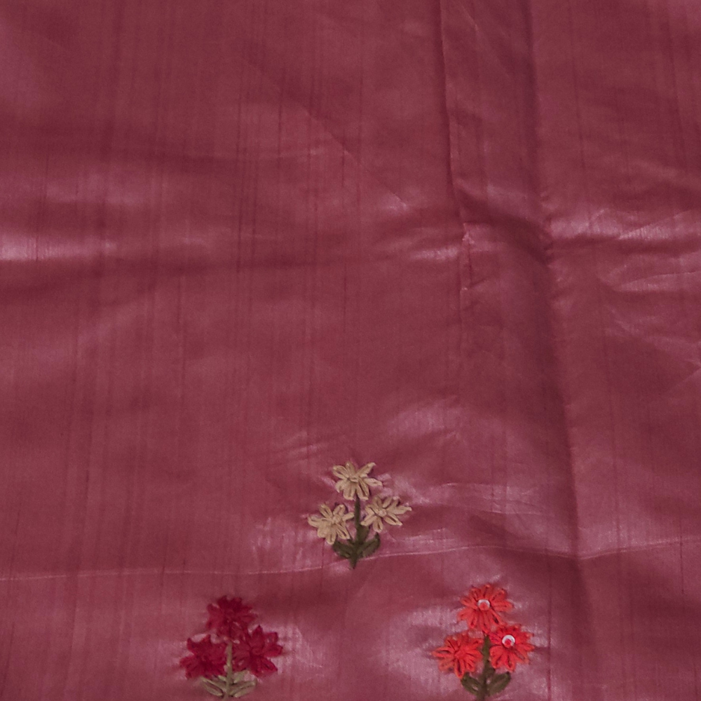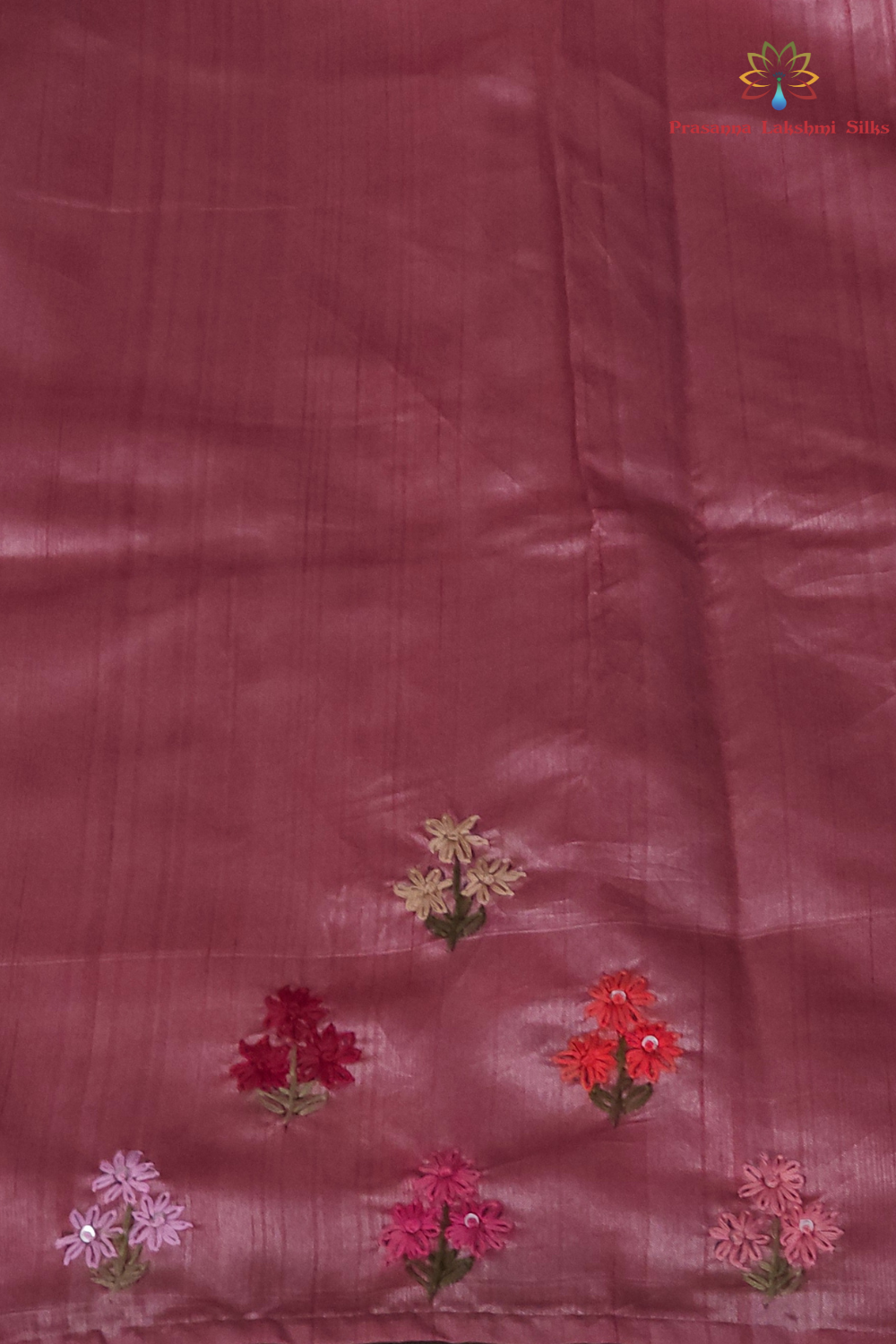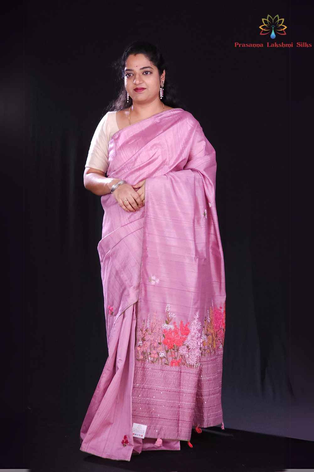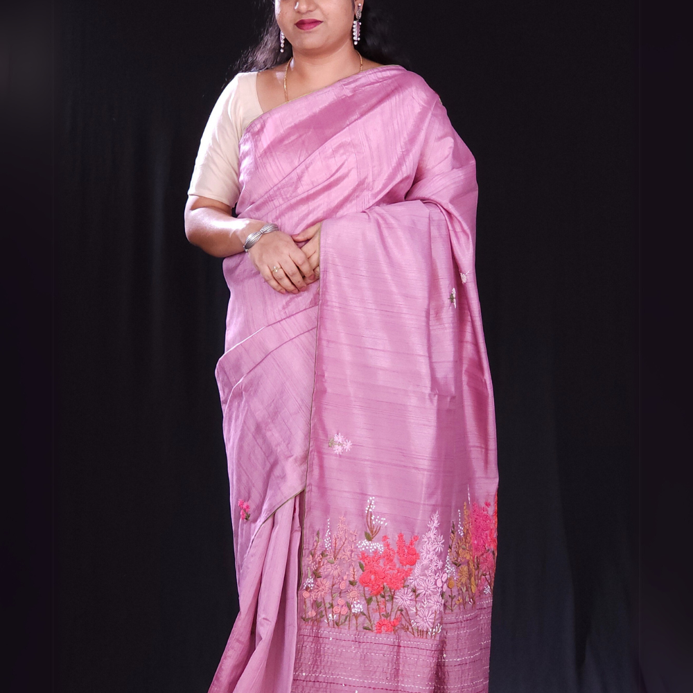 Semi Tussar sarees adorned with allover thread-woven floral motifs, a rich handwoven thread work pallu with French motifs and sequin touches, this saree is a perfect blend of tradition and grace. Paired with a running blouse.