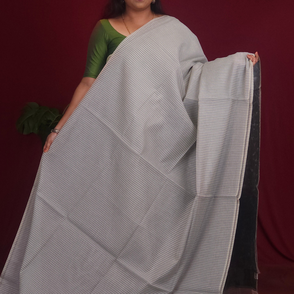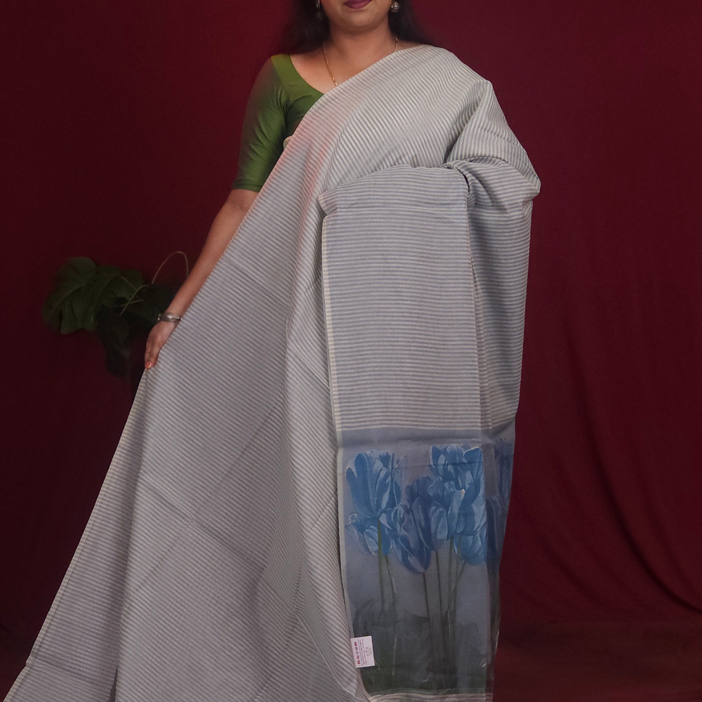 Elegant Chanderi silk cotton sarees allover vertical stripes designed with beautiful thread-woven pallu featuring a unique tulip design paired with a contrast floral brocade blouse....