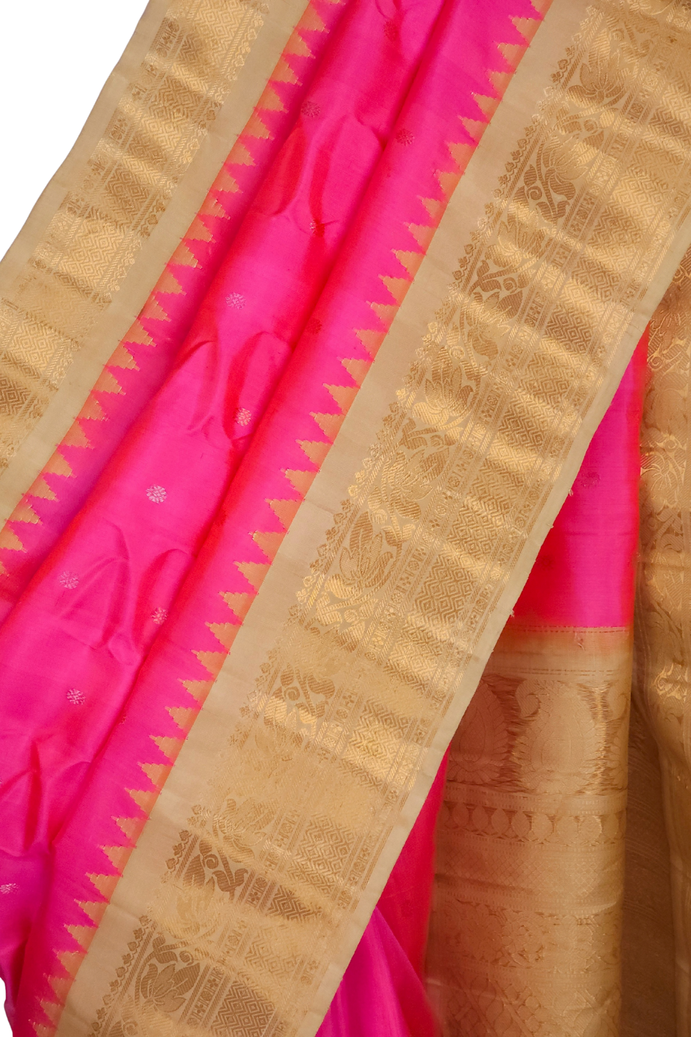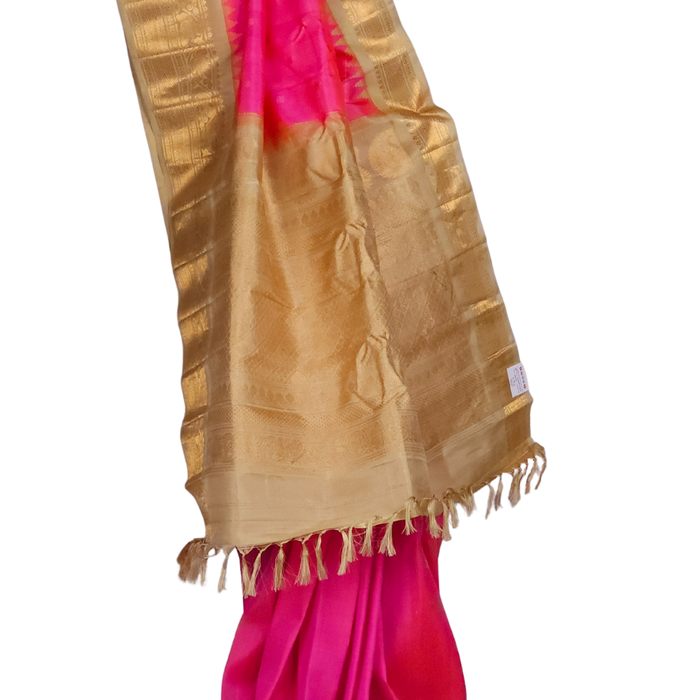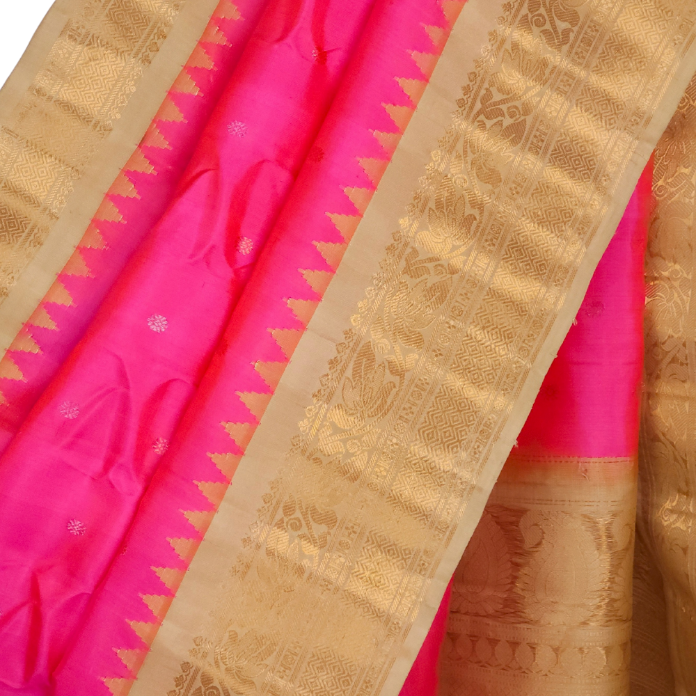 Elevate your elegance with our exquisite Handloom Gadwal Pure Silk Saree, adorned with Intricate zari motifs zari-woven borders Rich zari-woven brocade adorns the pallu, making every drape a statement.