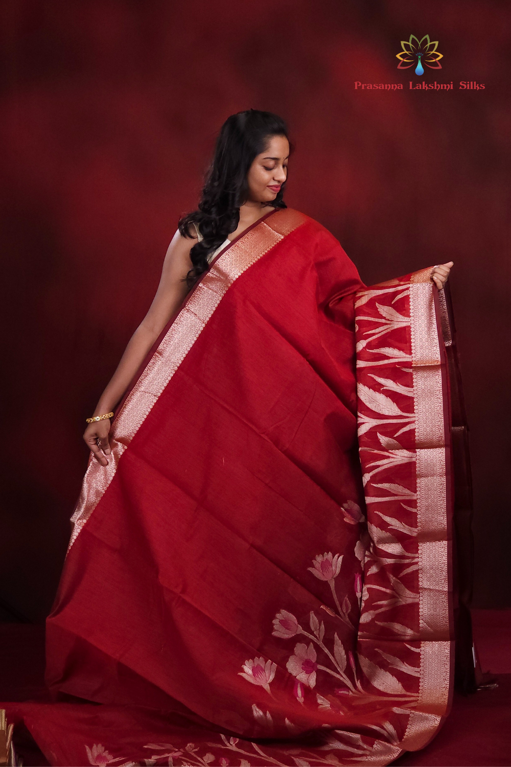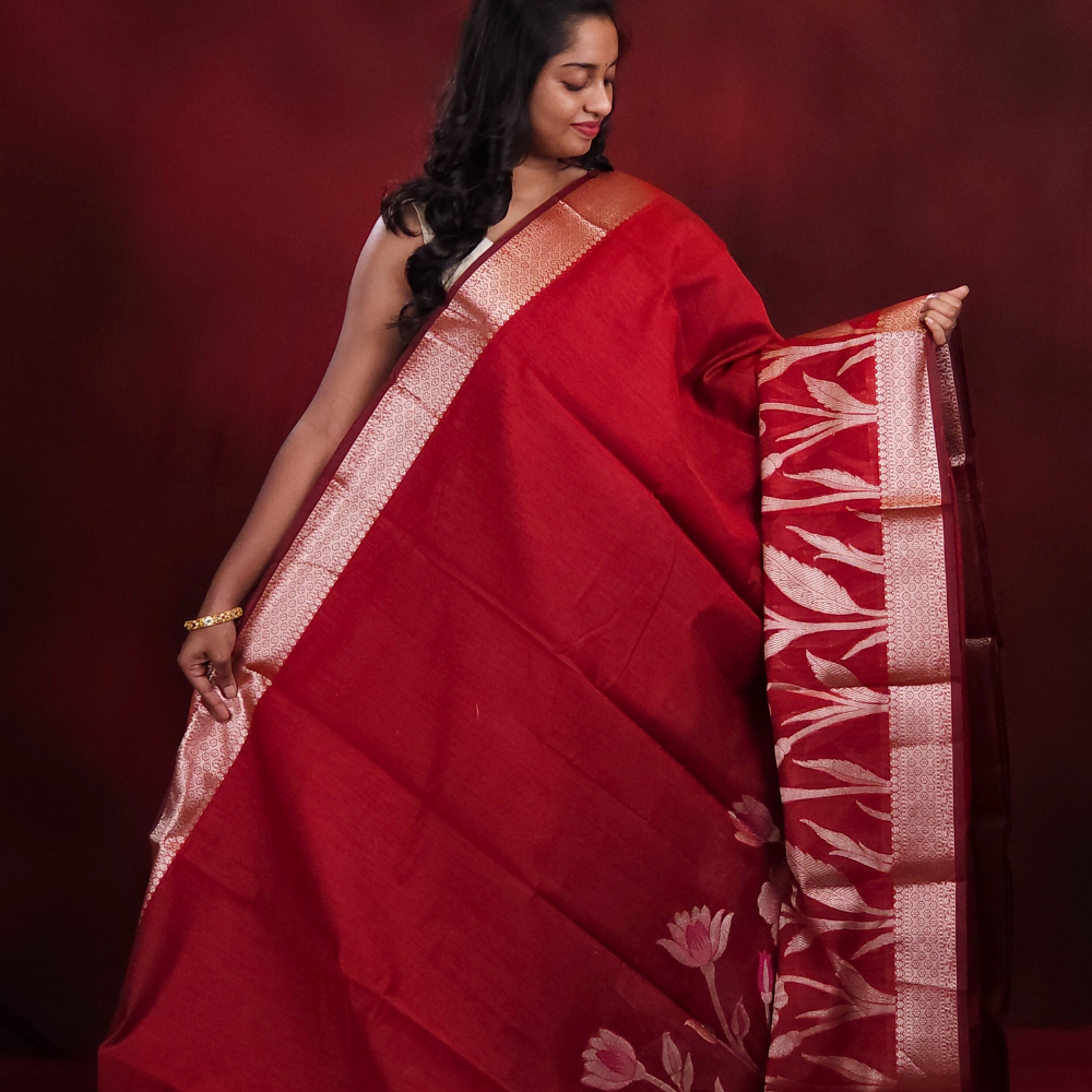 Beautiful Chanderi Saree, featuring allover horizontal zari stripes designed with a unique floral border detailing zari stripes pallu,and a running blouse