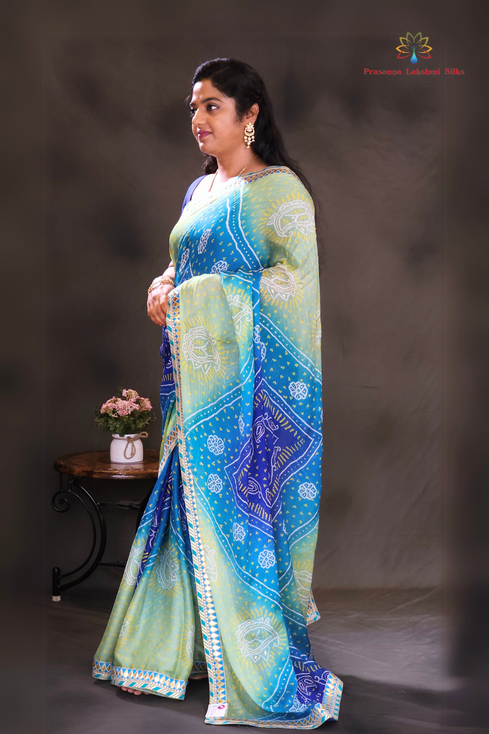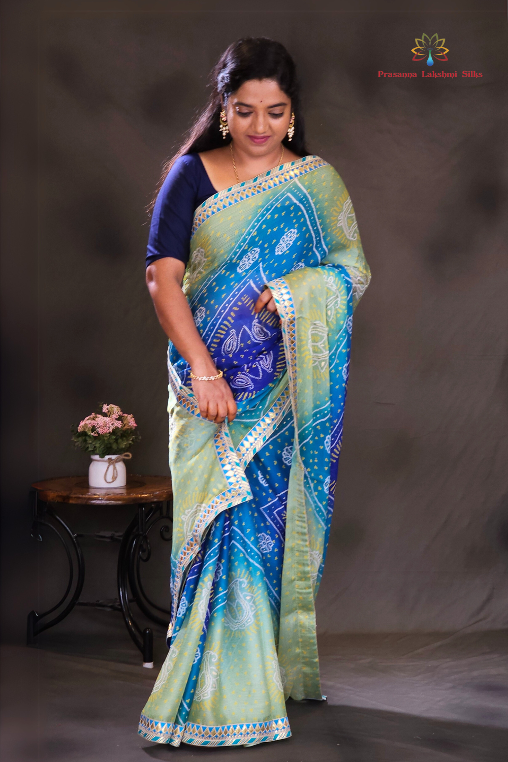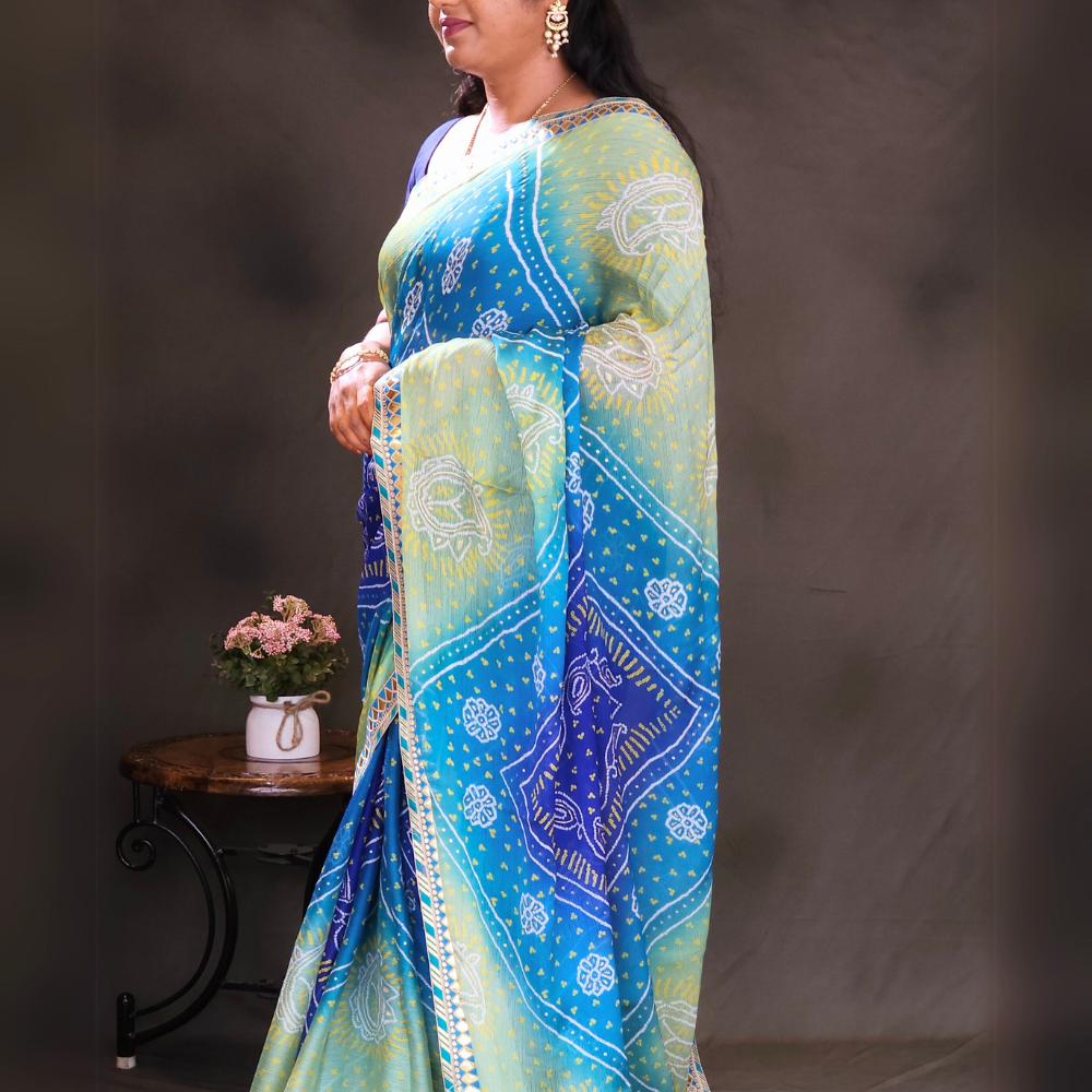 Elevate your style with chiffon Sarees, allover Bhandini print ,attached with lace borders ,pallu Paired with contrast designer blouse.....