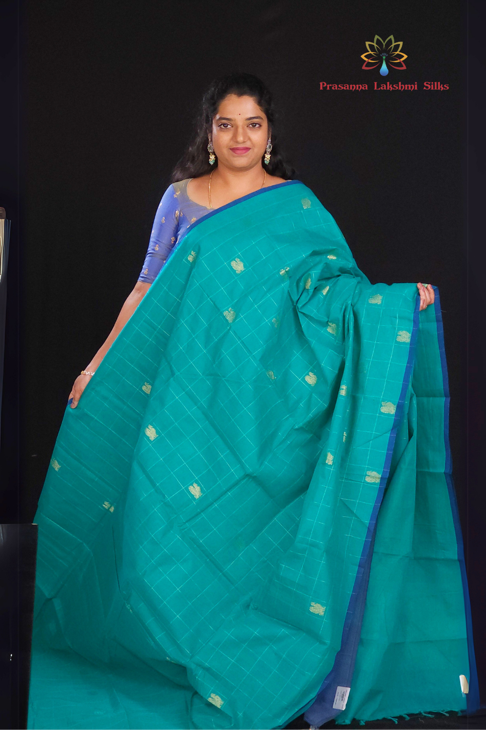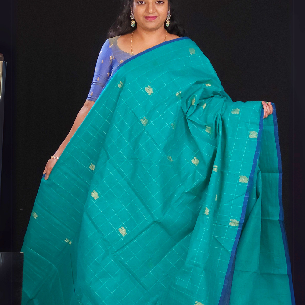 Experience the beauty of traditional sarees with our stunning Handloom Kanchi Cotton Saree,allover zari-woven checks, zari-woven peacock motifs, rich zari brocade pallu paired with running blouse.......