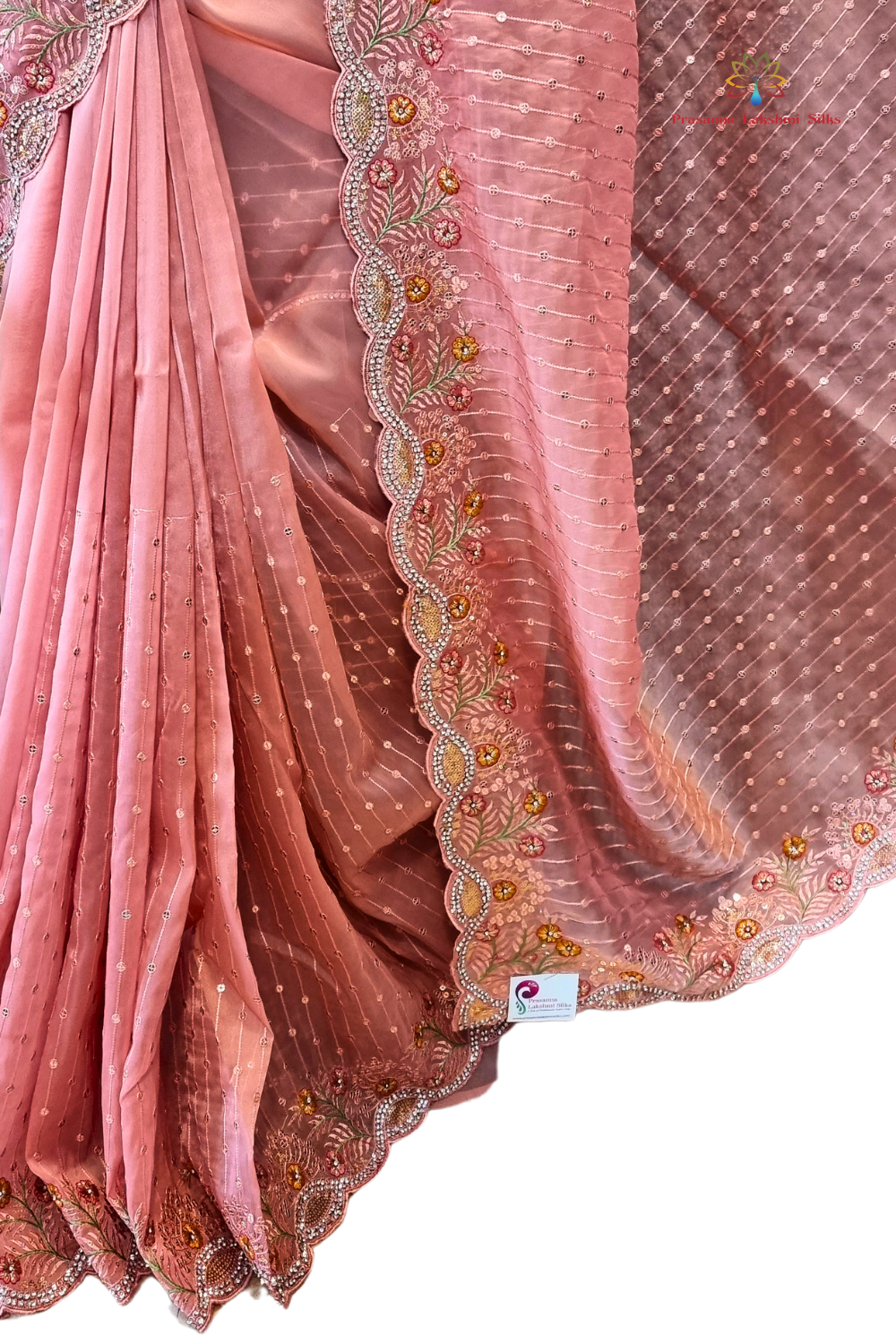 Experience the opulence of our Organza saree, allover stripes in sequence and threadwork with Floral sequence and stone work borders , pallu paired with designer blouse.......