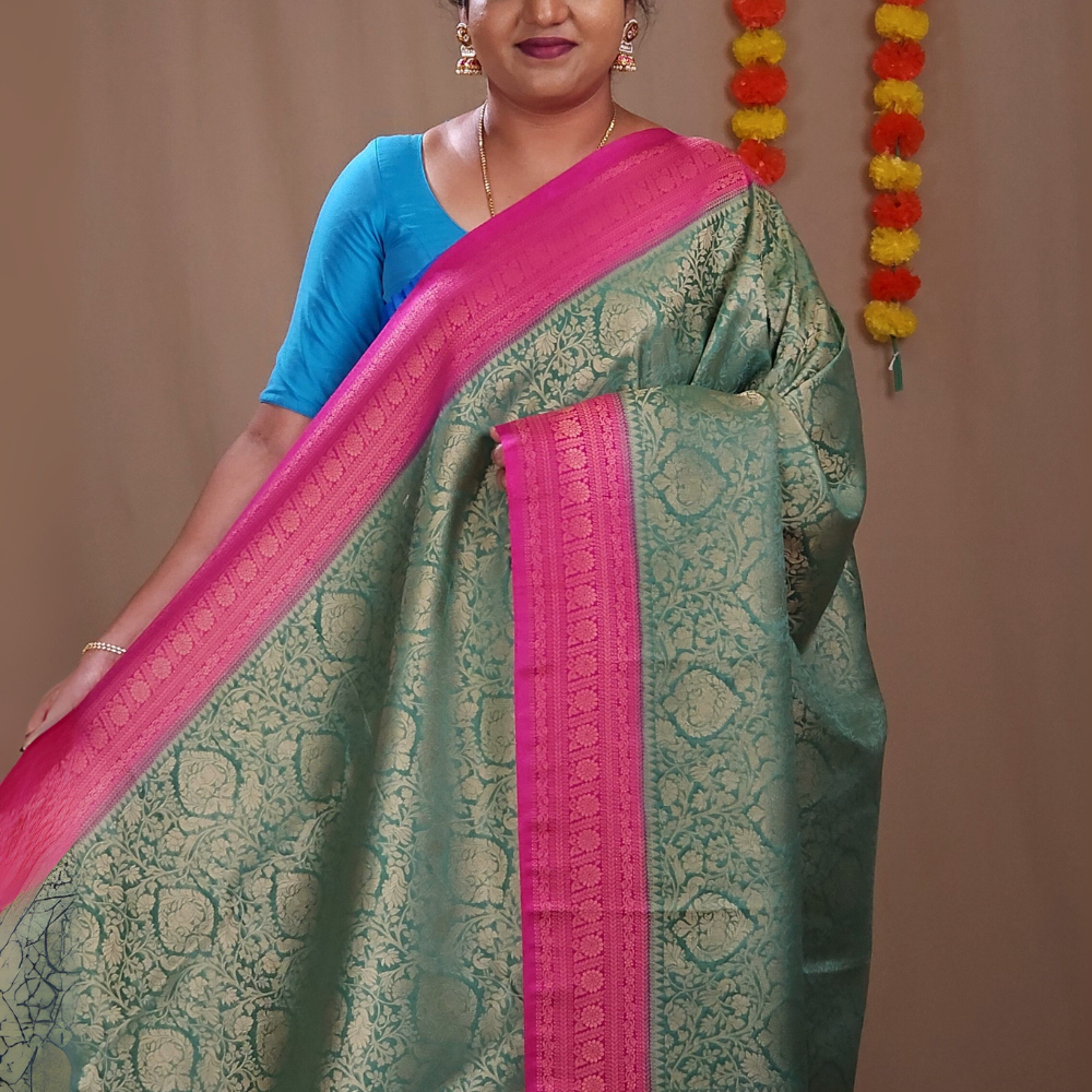 Experience timeless elegance with our Semi mysore silk, beautifully crafted with allover floral zari woven brocade with contrast zari-woven borders. A rich brocade pallu adds to the grandeur paired with a contrast blouse....
