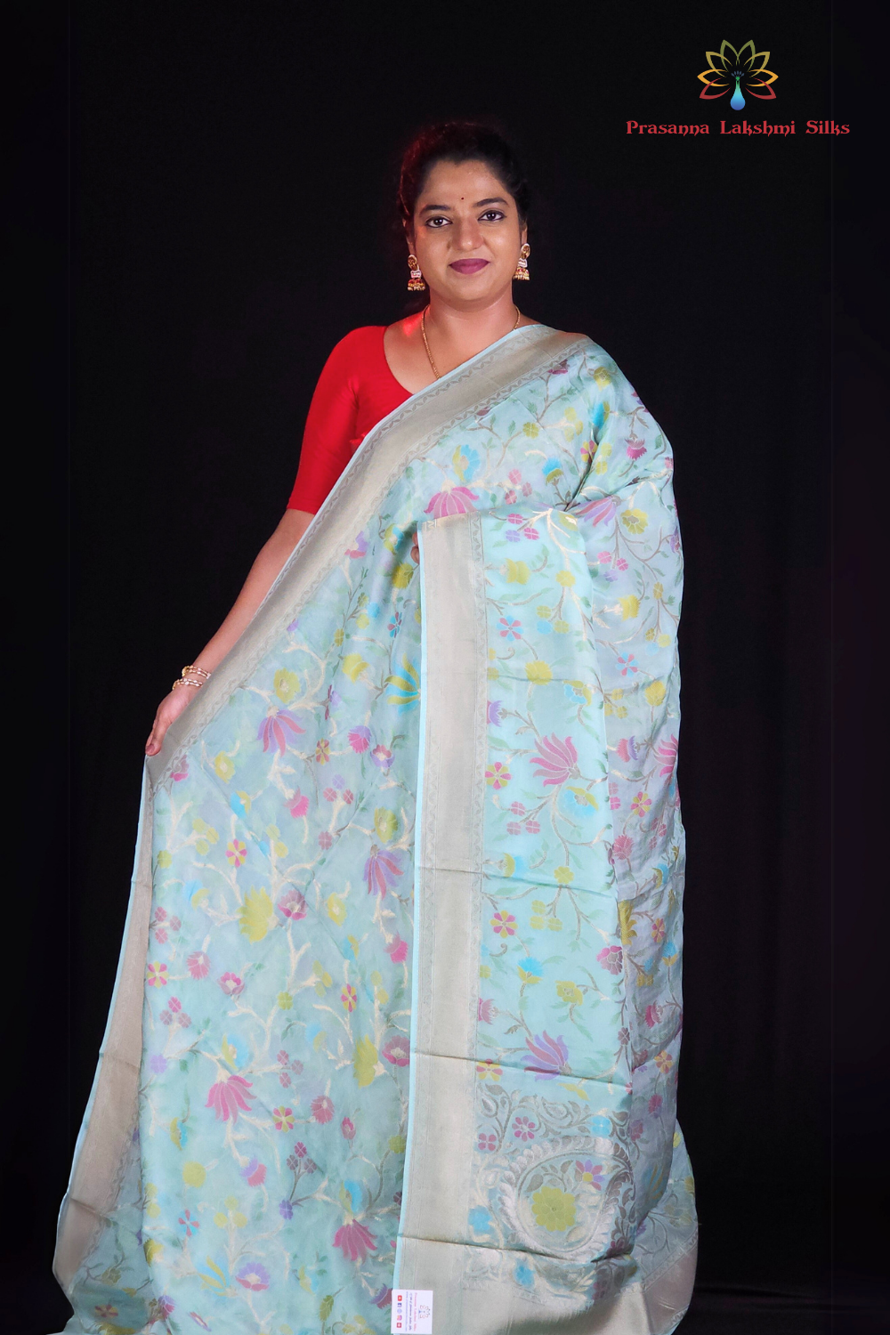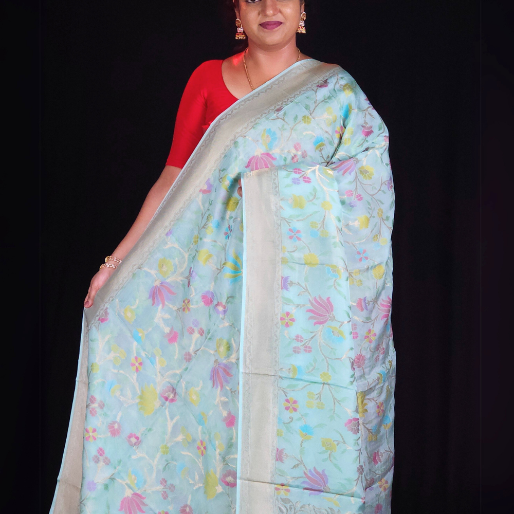 Organza saree Allover meenakaari floral weaving that looks rich and elegant, paired with gorgeous zari khaddi borders and a rich pallu.
