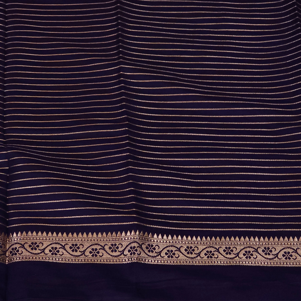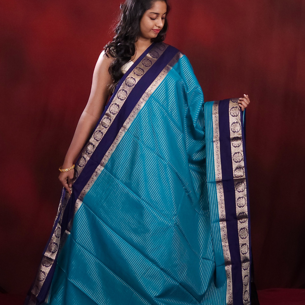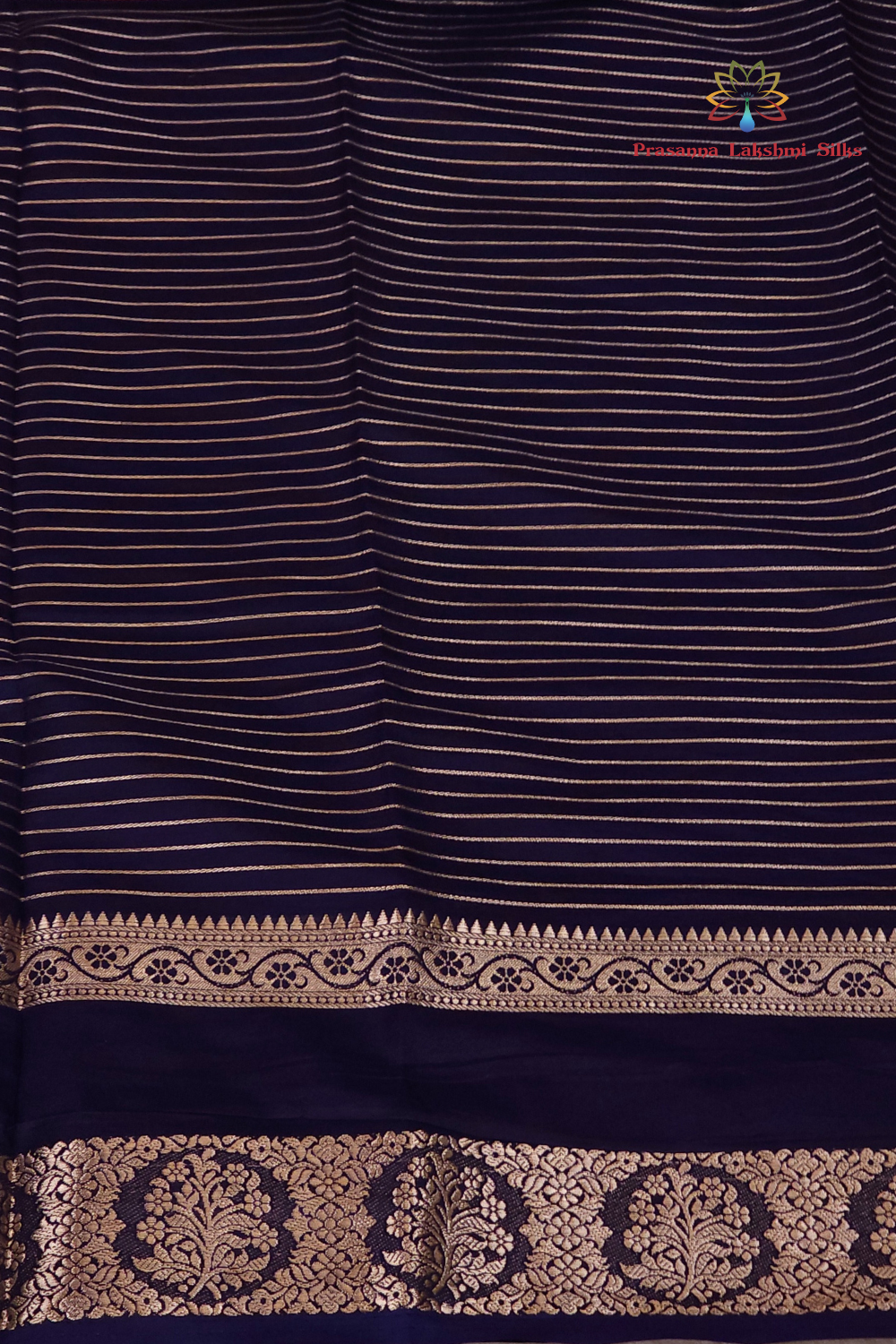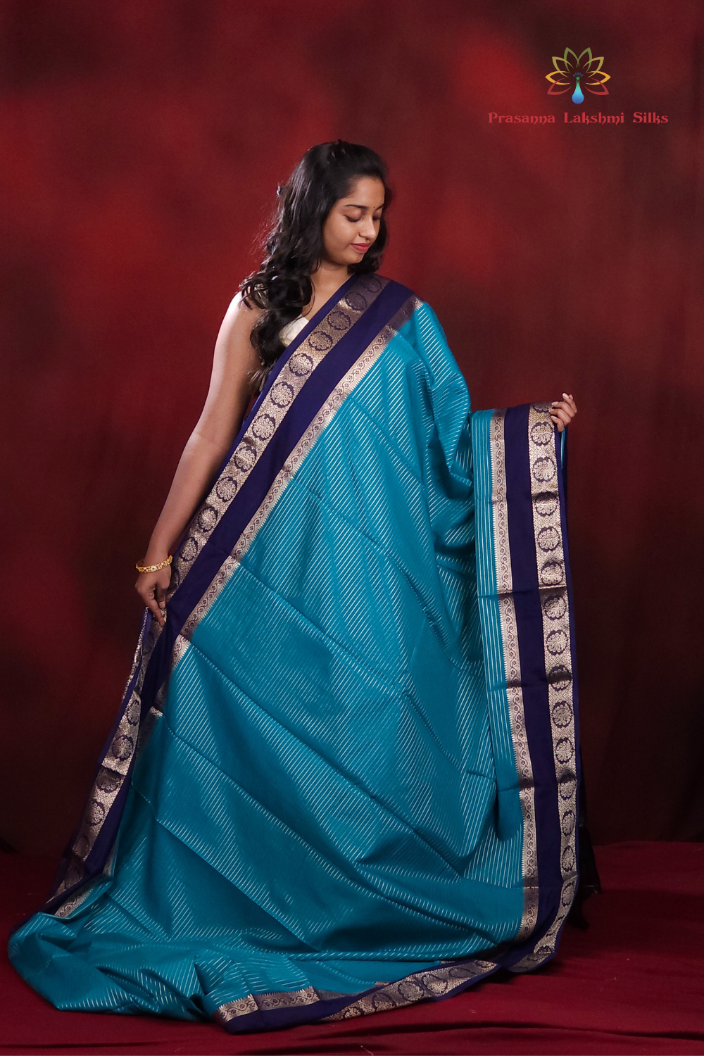 Experience the richness of Semi Mysore silk saree with zari woven stripes all over the saree, complemented by contrast gap borders, paired with contrast tissue stripe pallu and contrast blouse with zari woven motifs.....