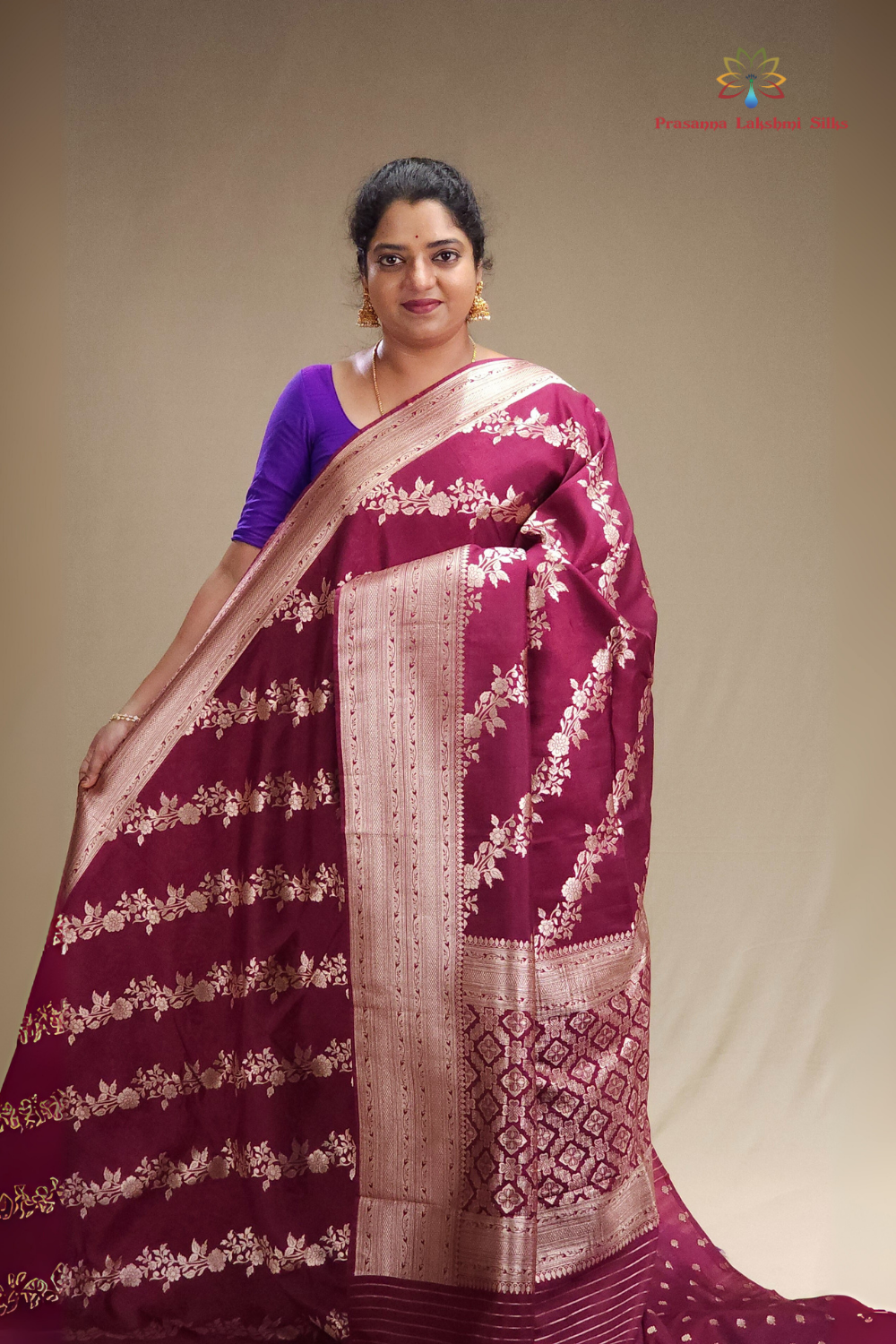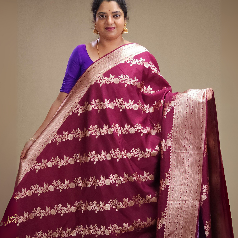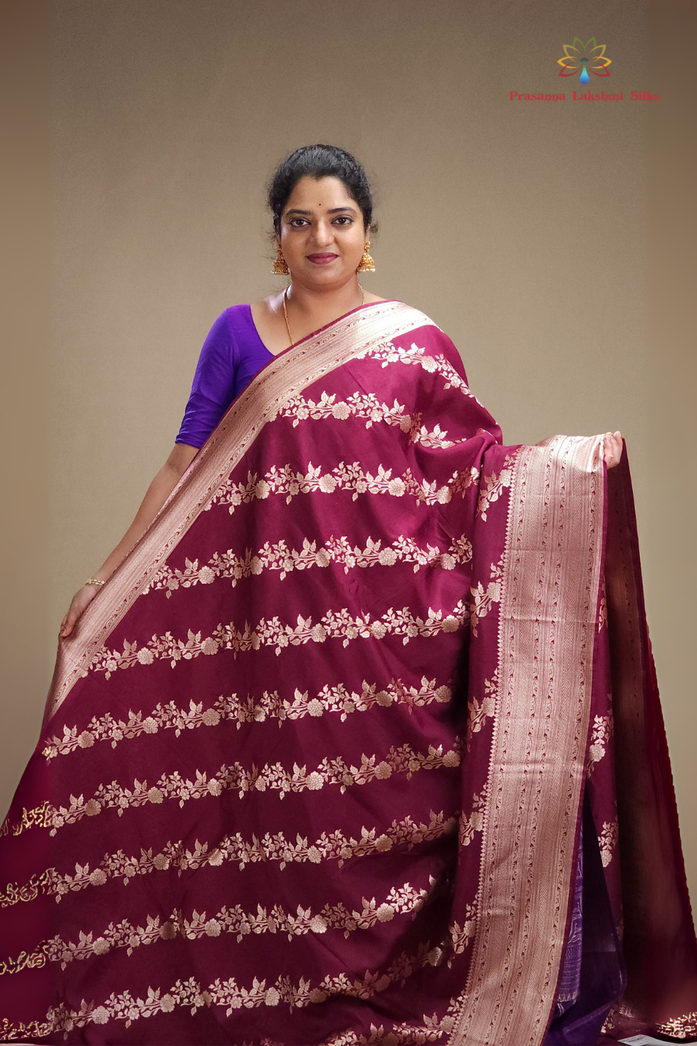 Experience timeless elegance with our Banarasi sarees, beautifully crafted with allover floral zari woven Lehariya with zari-woven borders. A rich brocade pallu adds to the grandeur paired with a running blouse....