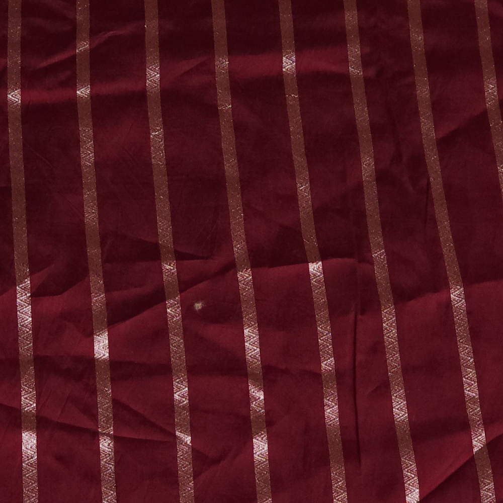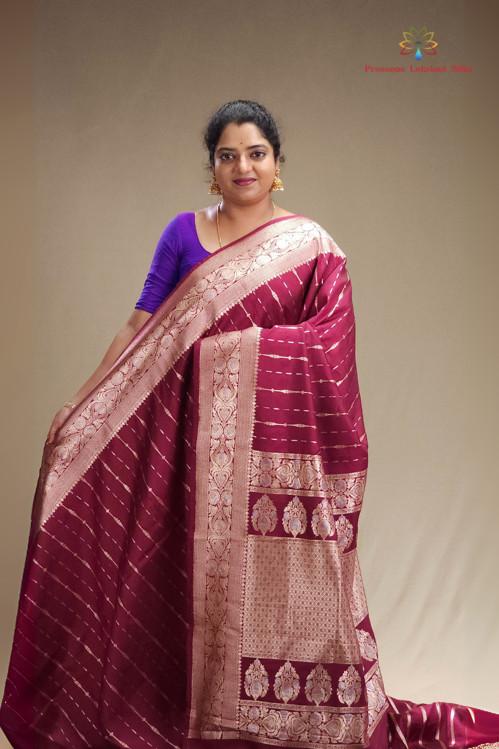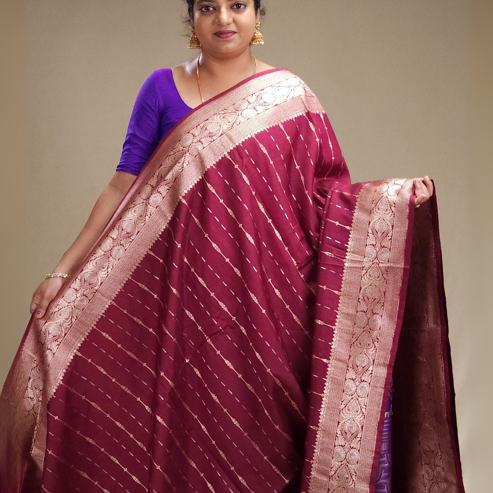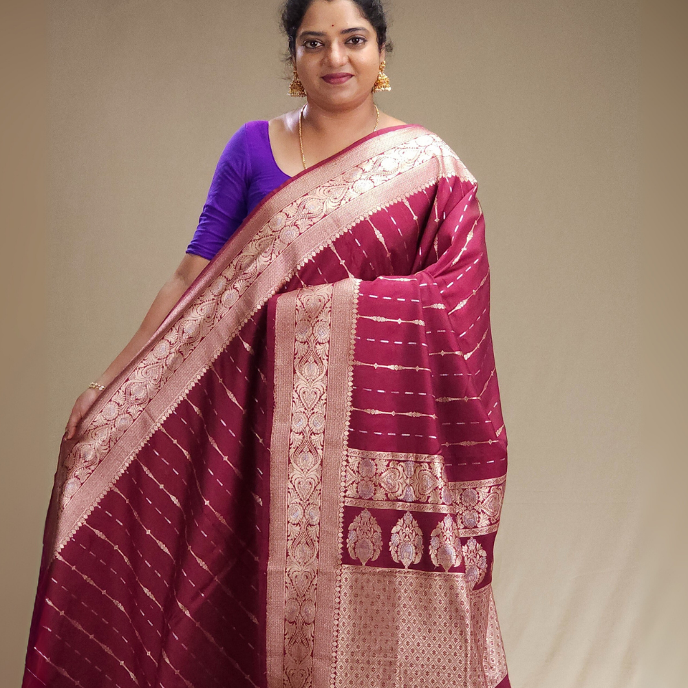 Experience timeless elegance with our Banarasi sarees, beautifully crafted with zari woven stripes design allover with zari-woven borders. A rich brocade pallu adds to the grandeur paired with a running blouse....